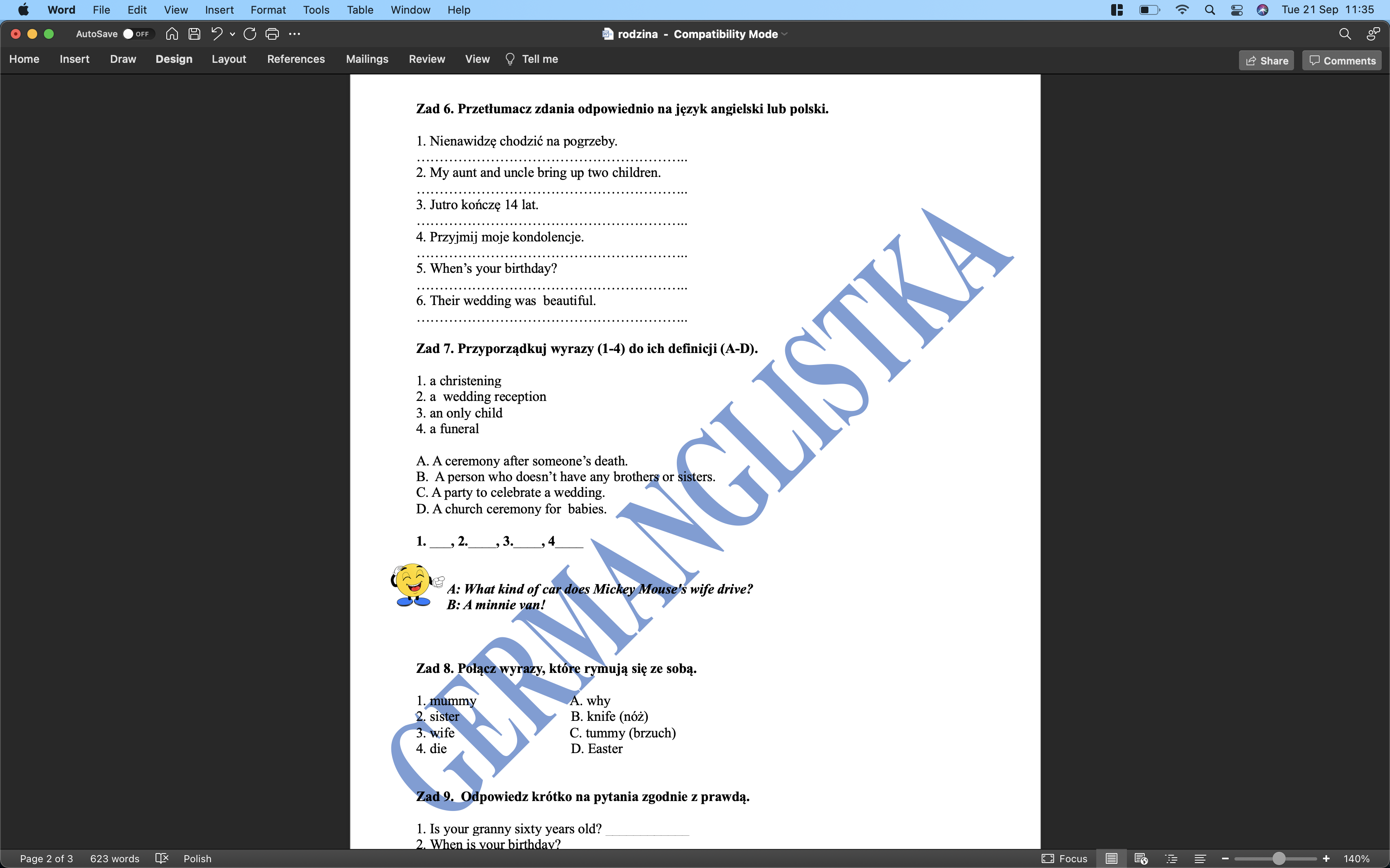 10 ćwiczeń z tematu RODZINA I UROCZYSTOŚCI RODZINNE z kluczem.