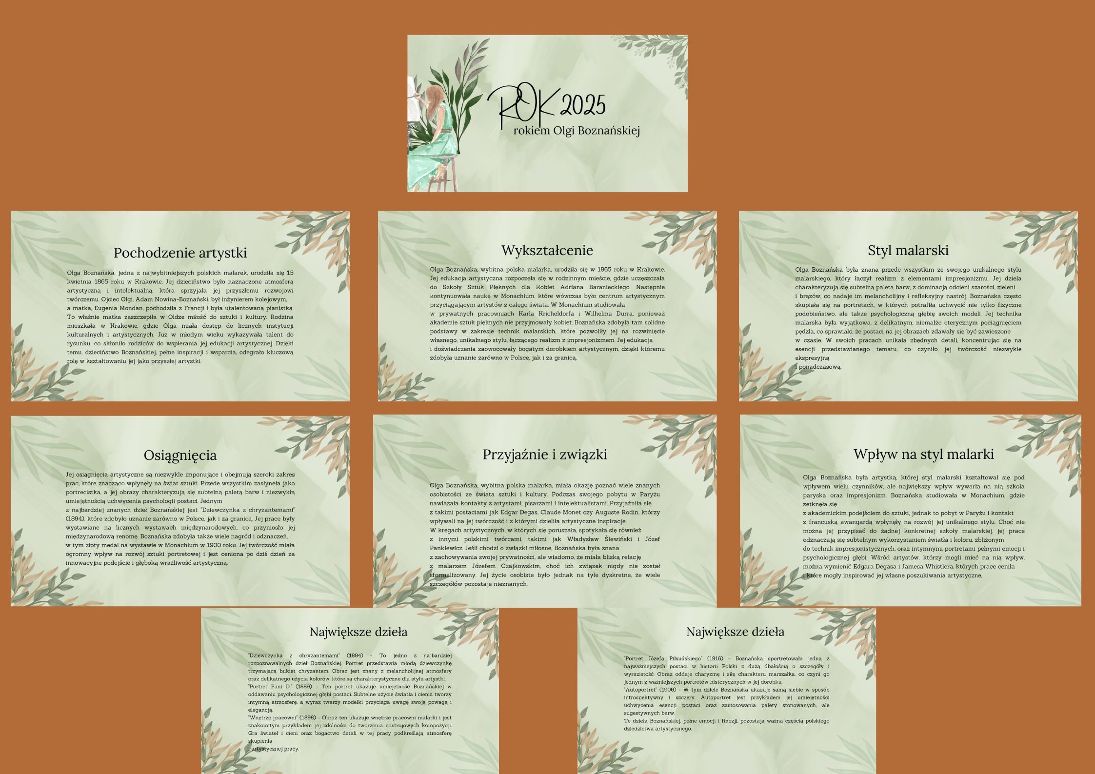 Materiał zawiera 9 stron zapisanych w formacie pdf. Stanowią go informacje na temat malarki Olgi Boznańskiej, która została ogłoszona patronką roku 2025.