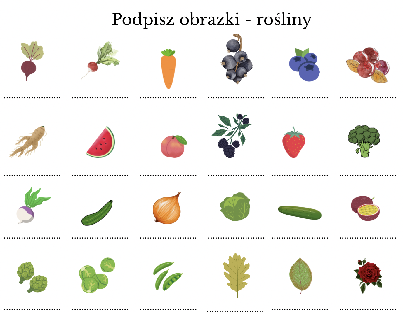 Ten wyjątkowy materiał edukacyjny łączy naukę poprawnej pisowni z fascynującym światem przyrody. Uczniowie mają za zadanie podpisać ilustracje przedstawiające różne rośliny, których nazwy zawierają trudności ortograficzne – takie jak rz, ż, ó, u, ch, h, ą, ę, ś, ź, dź, sz, cz.