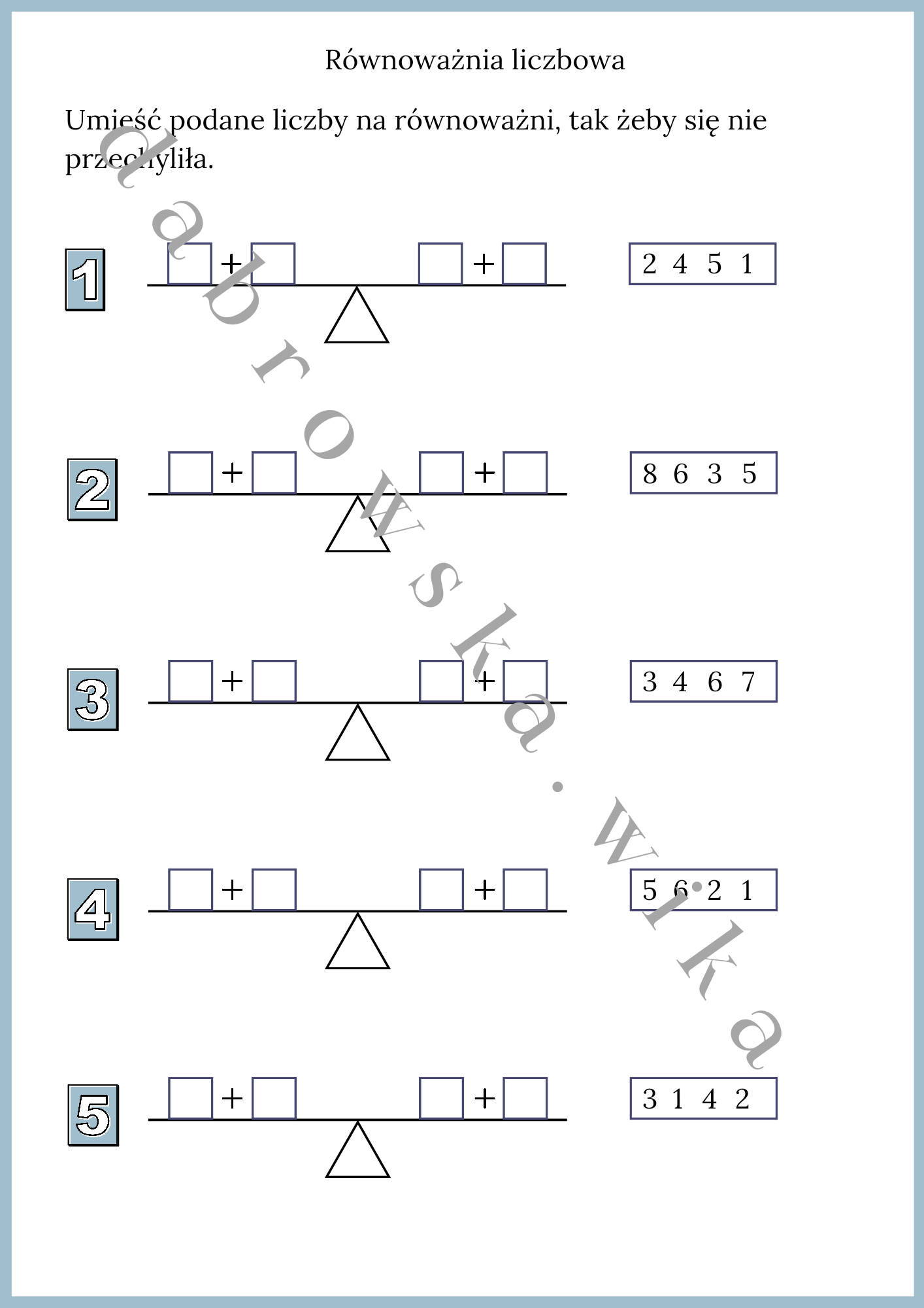 Należy umieścić podane liczby w odpowiednich miejscach na równoważni, tak aby zachowała równowagę. Miłej zabawy!