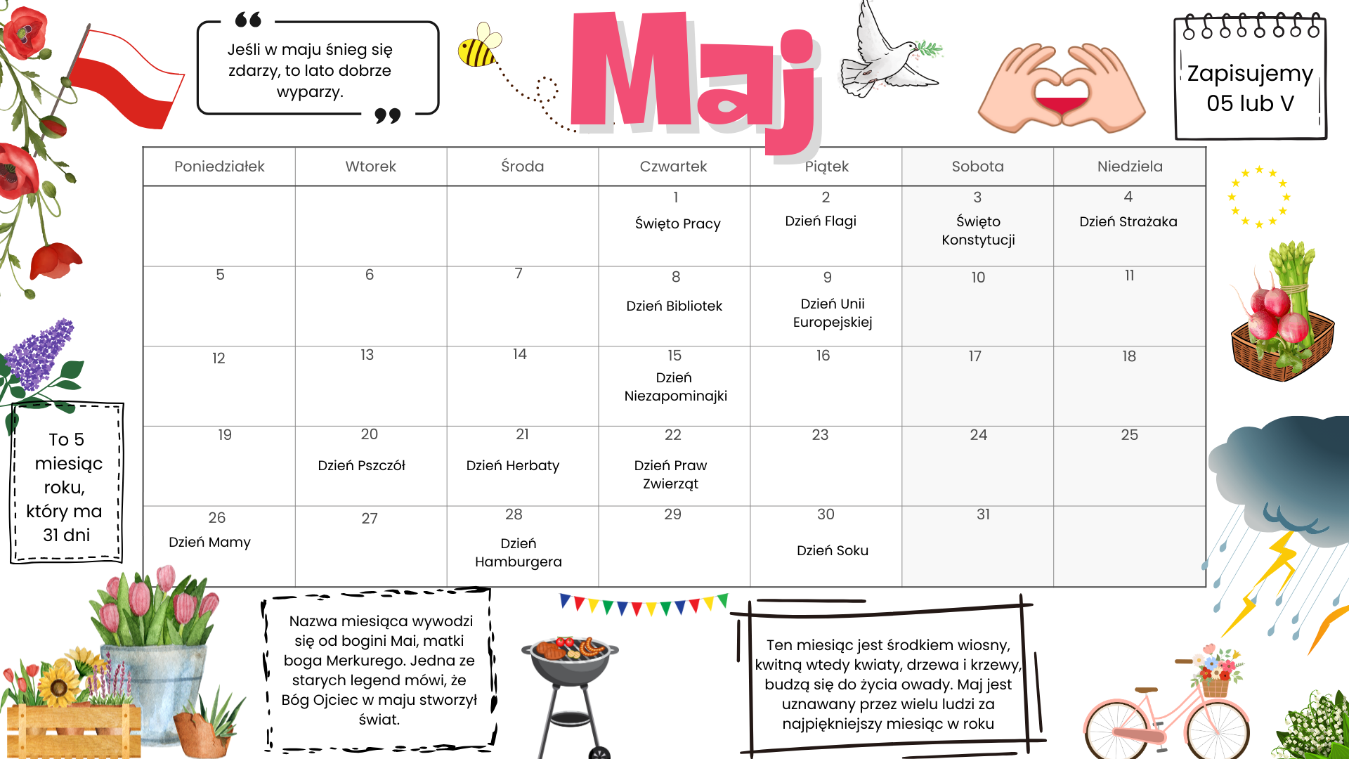 - kalendarz (informacje o danym miesiącu, dni nietypowe)