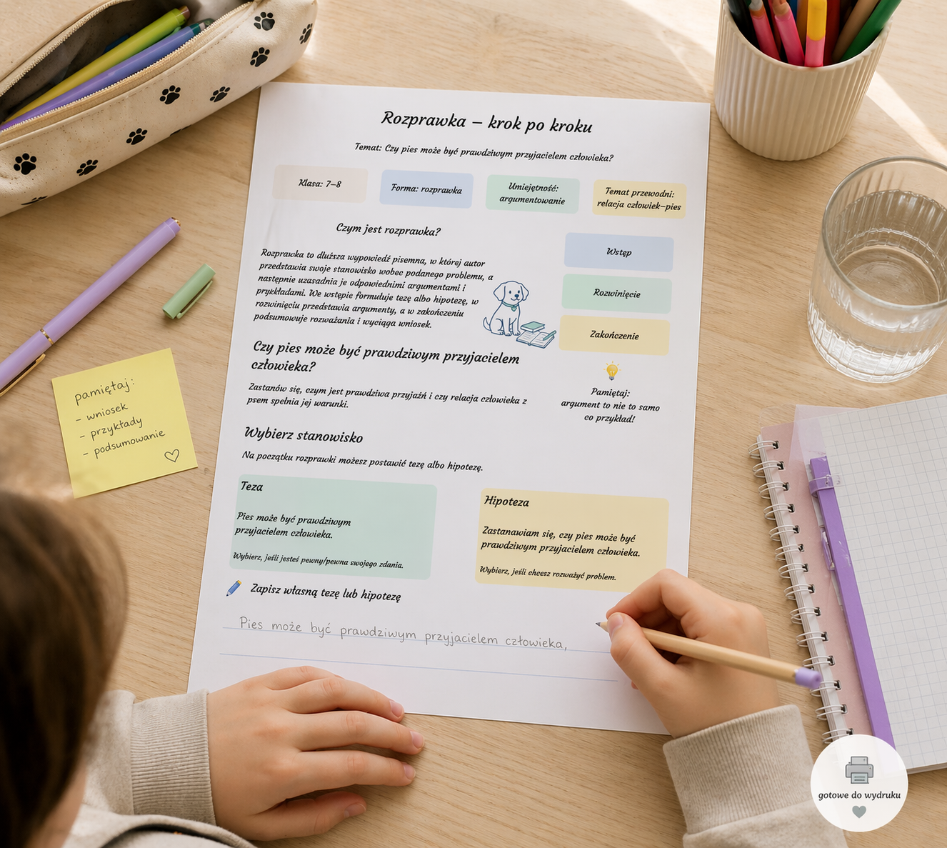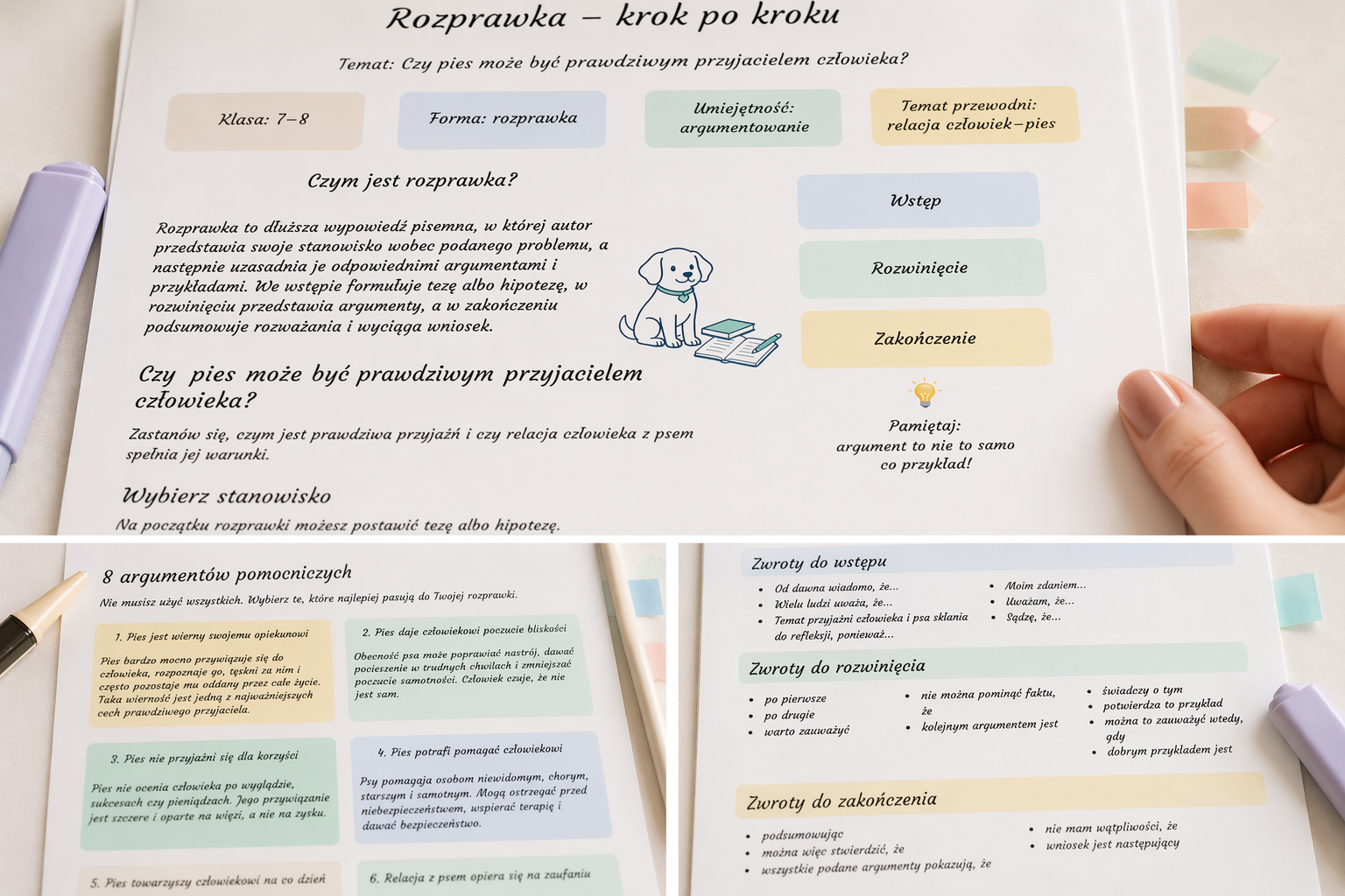 To materiał edukacyjny dla uczniów klas 7–8, który w bardzo przejrzysty i atrakcyjny sposób pokazuje, jak napisać rozprawkę na temat: „Czy pies może być prawdziwym przyjacielem człowieka?”