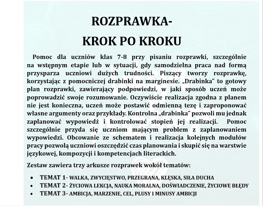 Pomoc dla uczniów klas 7-8 przy pisaniu rozprawki, szczególnie na wstępnym etapie lub w sytuacji, gdy samodzielna praca nad formą przysparza uczniowi dużych trudności. Piszący tworzy rozprawkę, korzystając z pomocniczej drabinki na marginesie. „Drabinka” to gotowy plan rozprawki, zawierający podpowiedzi, w jaki sposób uczeń może poprowadzić swoje rozumowanie. Oczywiście realizacja zgodna z planem nie jest konieczna, uczeń może postawić odmienną tezę i zaproponować własne argumenty oraz przykłady. Kontrolna „drabinka” pozwoli mu jednak zaplanować wypowiedź i kontrolować stopień jej realizacji. Pomoc szczególnie przyda się uczniom mającym problem z zaplanowaniem wypowiedzi. Obcowanie ze schematem i realizacja kolejnych modułów pracy pozwolą uczniowi oszczędzić czas planowania i skupić się na warstwie językowej, kompozycji i kompetencjach literackich.
