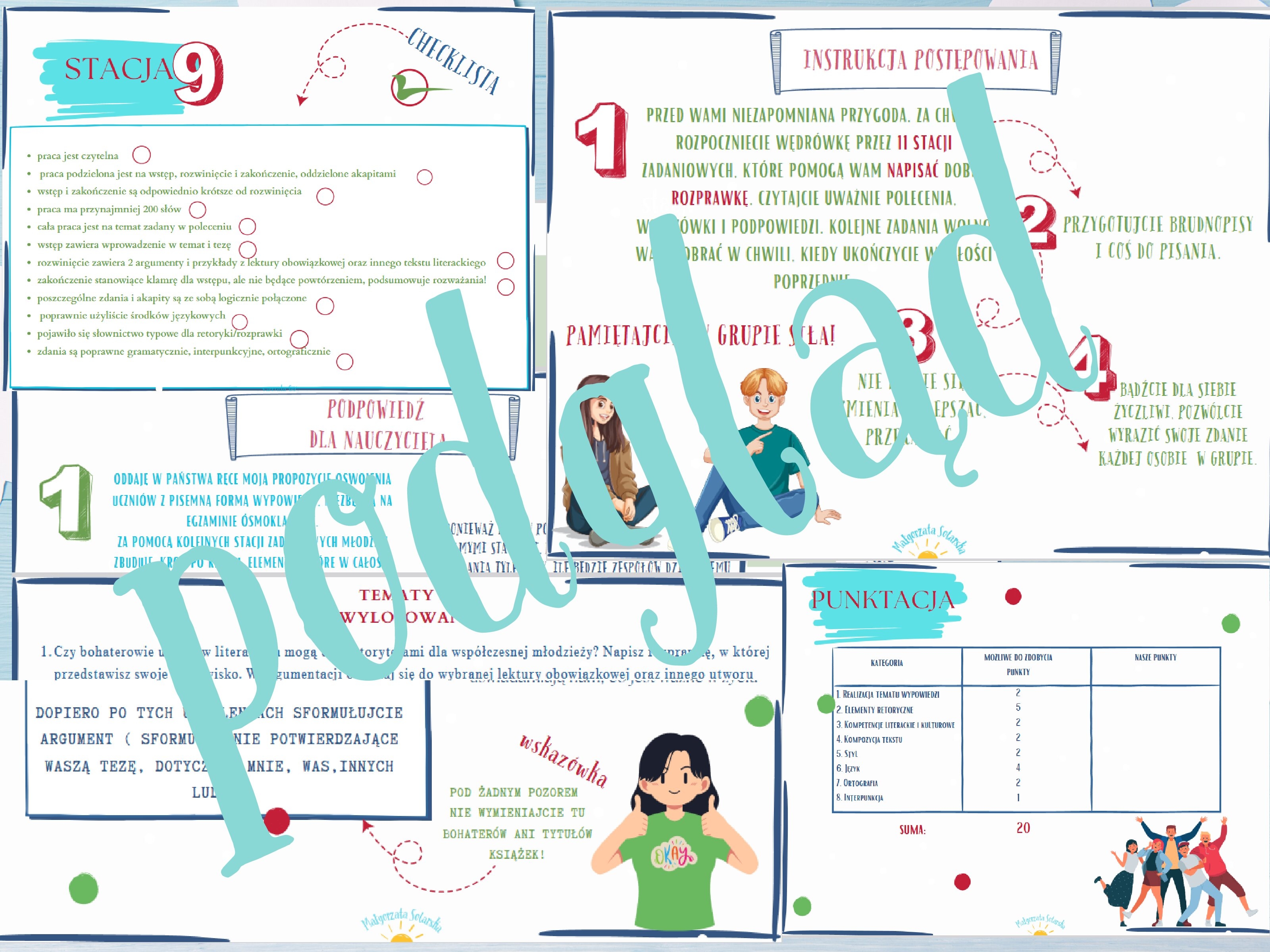 11 stacji zadaniowych to przyjemna dla uczniów forma pracy nad rozprawką. Kolejne przystanki odsłaniają, krok, po kroku, wskazówki, które pozwolą uczniom z zaangażowaniem okiełznać te trudną dla nich formę wypowiedzi pisemnej.