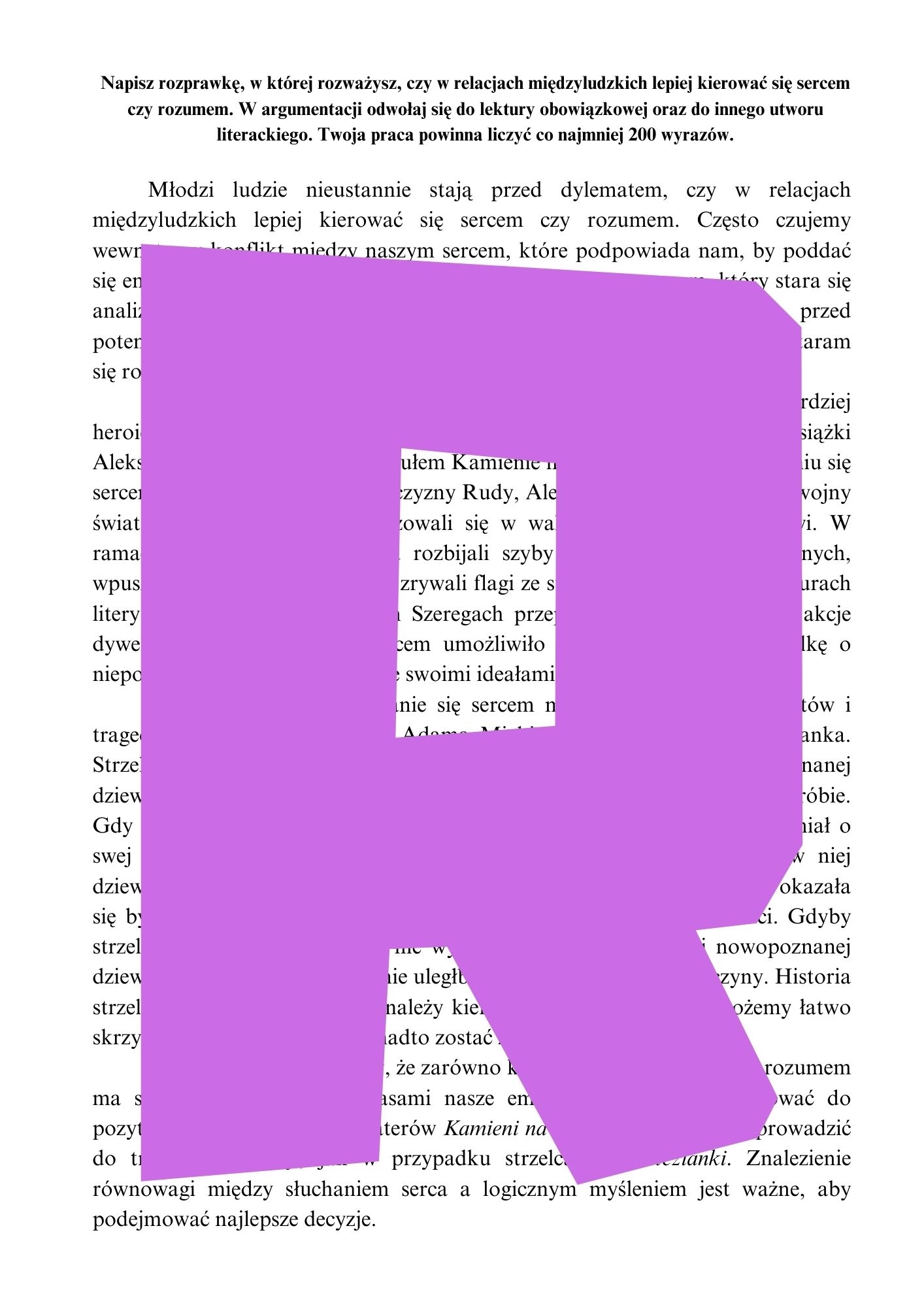Napisz rozprawkę, w której rozważysz, czy w relacjach międzyludzkich lepiej kierować się sercem czy rozumem. W argumentacji odwołaj się do lektury obowiązkowej oraz do innego utworu literackiego. Twoja praca powinna liczyć co najmniej 200 wyrazów.