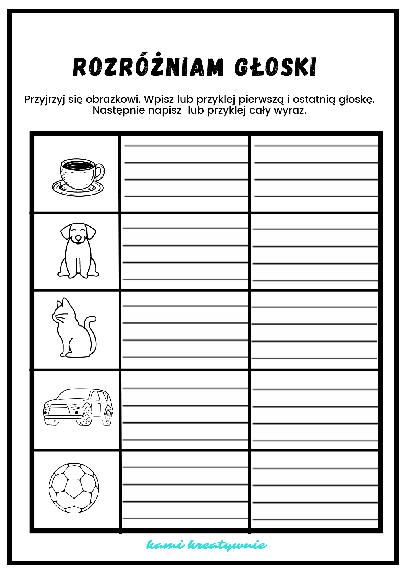 Zadaniem dziecka jest podanie nazwy obrazka, pierwszej i ostatniej głoski.