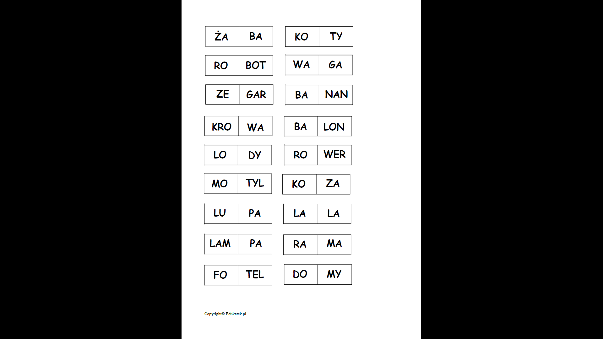 W skład zestawu wchodzi 60 obrazków (30 x wyrazów dwusylabowych i 30x wyrazów trzysylabowych) do wydrukowania oraz lista 60 wyrazów podzielonych na sylaby.