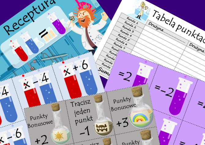 GRA Laboratorium Chemika to świetny sposób, aby zaangażować uczniów w rozwiązywanie prostych równań (rozwiązywalnych w jednym lub w dwóch krokach). Wynikami są liczby całkowite i ułamki. Uczniowie mogą grać 1:1 lub w zespołach. Jeden zespół musi ułożyć równanie przy użyciu składników laboratoryjnych zgodnie z recepturą. Następnie druga drużyna musi rozwiązać to równanie, aby zdobyć punkt. Gra zawiera również karty punktów bonusowych i utraty punktów. Produkt zawiera dwie wersje gry: 1. Gra RÓWNANIA rozwiązywalne w jednym kroku. 2. Gra RÓWNANIA rozwiązywalne w dwóch krokach. Ten produkt zawiera: – Edytowalną wersję gry w PowerPoint™. – Wersję do druku PDF (kolor). – Wersję do druku PDF (czarno-biała).
