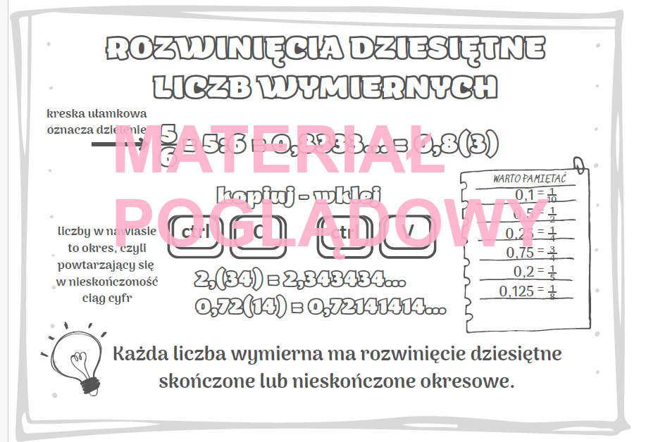 Rozwinięcia dziesiętne liczb wymiernych (ułamki okresowe) - notatka + karta pracy klasy 6, 7, 8