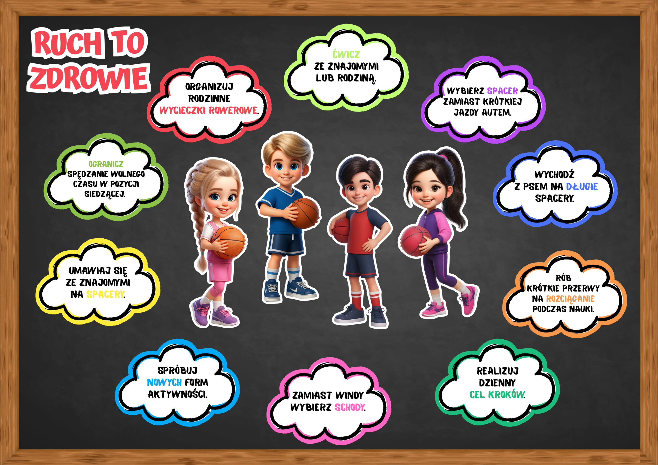 Gazetka pod tytułem „Ruch to zdrowie” promuje aktywny tryb życia wśród dzieci i młodzieży. Zawiera kolorowe hasła zachęcające do różnych form ruchu, takich jak spacery, jazda na rowerze, ćwiczenia z rodziną, wybieranie schodów zamiast windy czy próbowanie nowych aktywności. Podkreśla także znaczenie ograniczania czasu spędzanego w pozycji siedzącej i wprowadzania krótkich przerw na rozciąganie. Całość ma na celu uświadamianie uczniów, że codzienna aktywność to prosty sposób na zdrowie i dobre samopoczucie.
