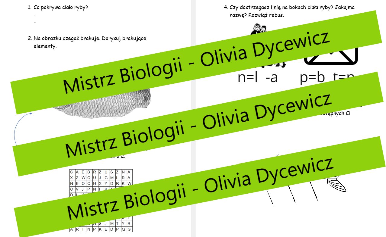 Jest to materiał, który można wykorzystać podczas lekcji o rybach. Zachęcam do zakupu w sklepie spożywczym prawdziwej, surowej ryby (całej lub wypatroszonej). Proponuję, aby uczniowie bez wcześniejszej nauki o rybach dostali notatkę do uzupełnienia i zrobili to z pomocą ryby, które będzie leżała w sali lekcyjnej. Nauczyciel może też wykorzystać zadania jako formę sprawdzenia wiedzy uczniów po przeprowadzonej lekcji.