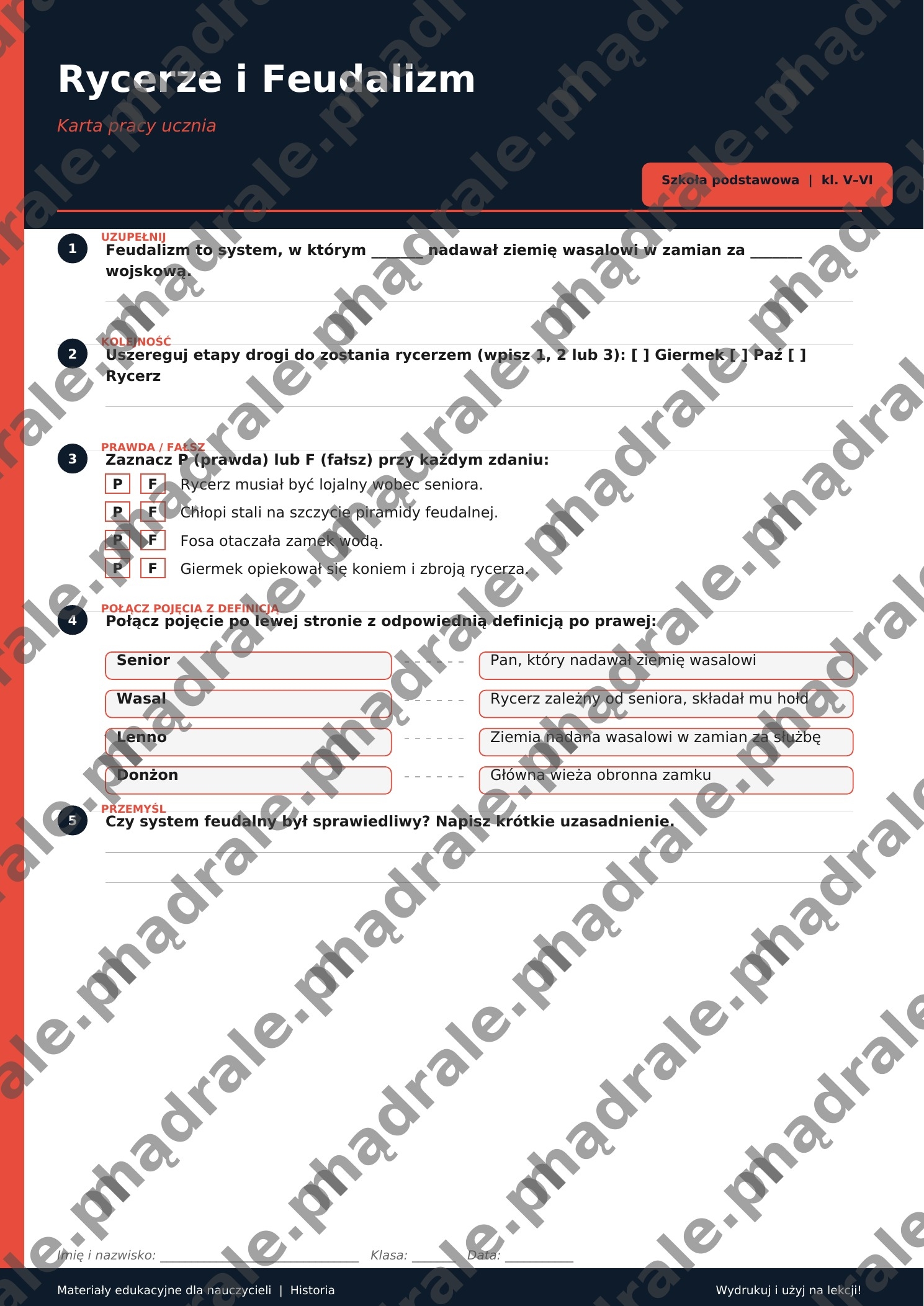🧩 Kartę pracy z zadaniami dotyczącymi rycerstwa i systemu feudalnego (m.in. obowiązki wasala i seniora, etos rycerski, życie na zamku).