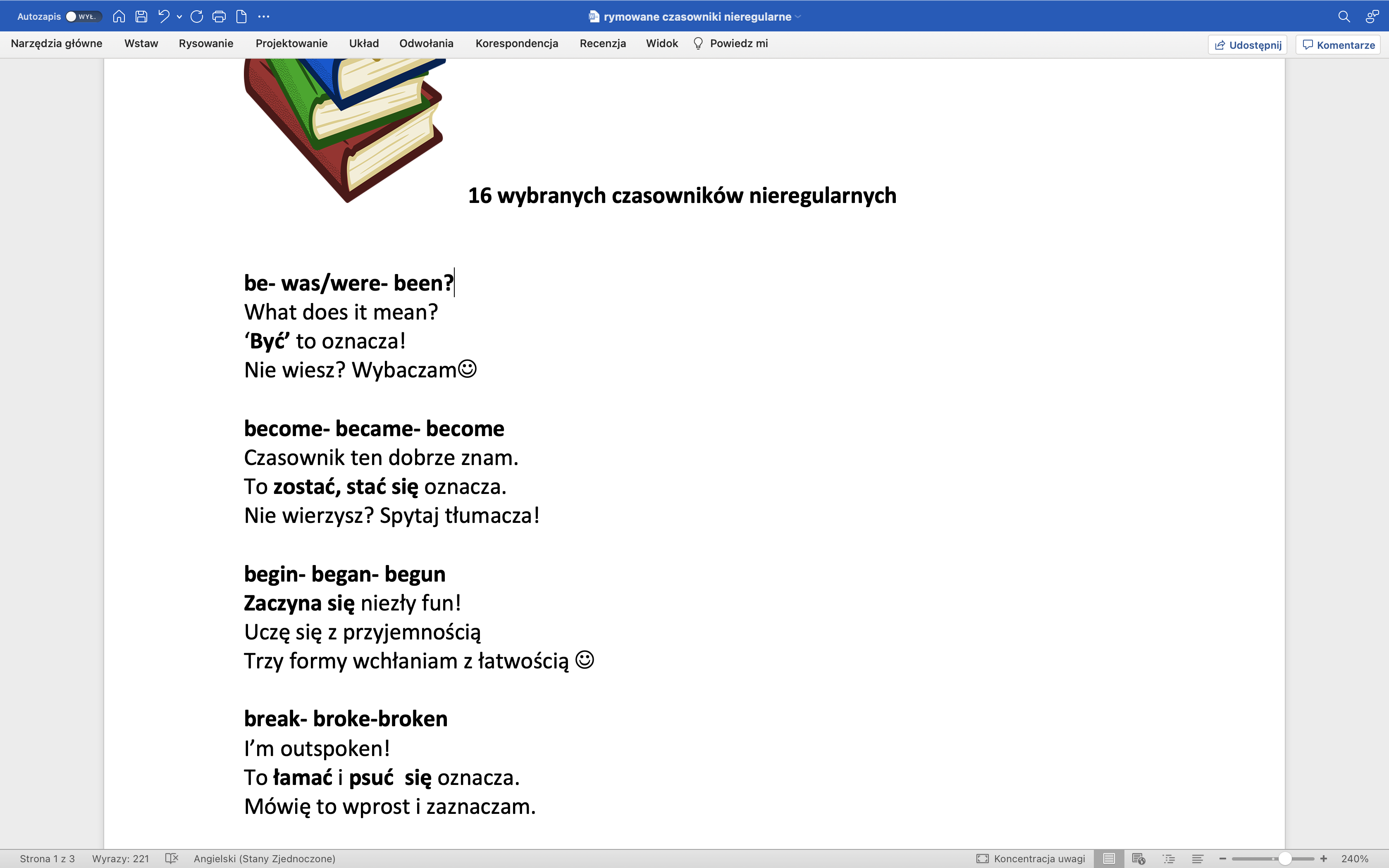 16 wybranych czasowników nieregularnych w angielsko-polskich rymowankach, które ułatwiają ich zapamiętywanie. Rymowanki są bardzo proste i zawierają każdorazowo 3 formy danego czasownika i jego tłumaczenie.