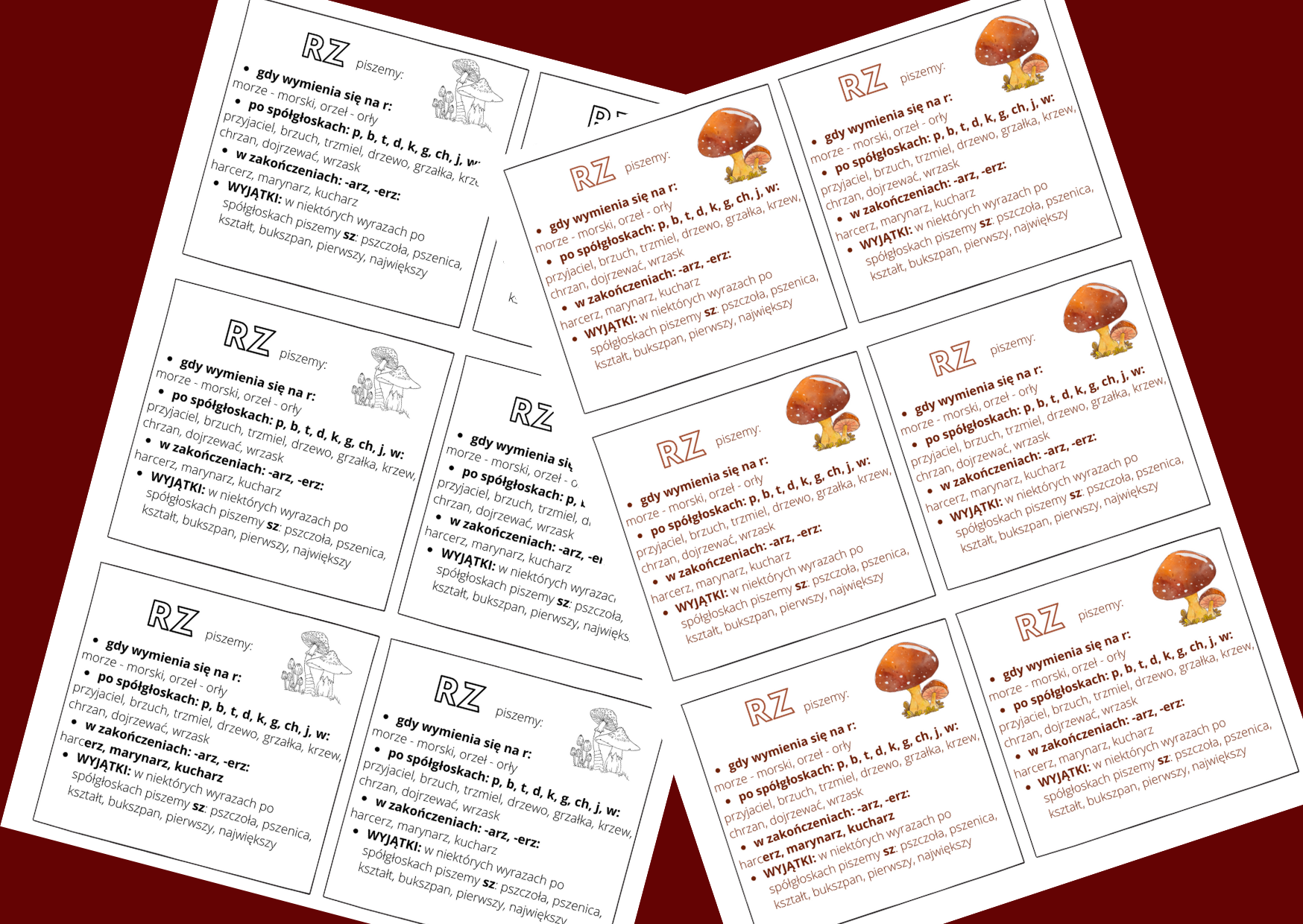 Zestaw zawiera 2 karty wklejek do zeszytu z zasadami ortograficznymi dotyczącymi pisowni wyrazów z "rz" (wersja czarno-biała i wersja kolorowa).