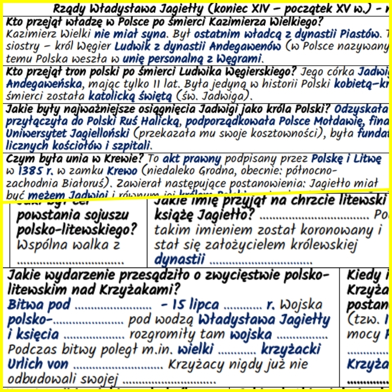 Notatki w formie pytań i odpowiedzi omawiające okres rządów Ludwika Węgierskiego, jego córki Jadwigi i jej męża Władysława Jagiełły, przygotowane dla klasy 5 według podstawy programowej nauczania historii w szkole podstawowej (Podstawa programowa – Historia – Szkoła podstawowa IV-VIII) oraz utrwalająca wiedzę karta pracy zawierająca luki w treści wymagające uzupełnienia ustnego lub pisemnego.