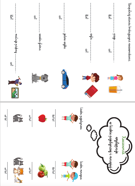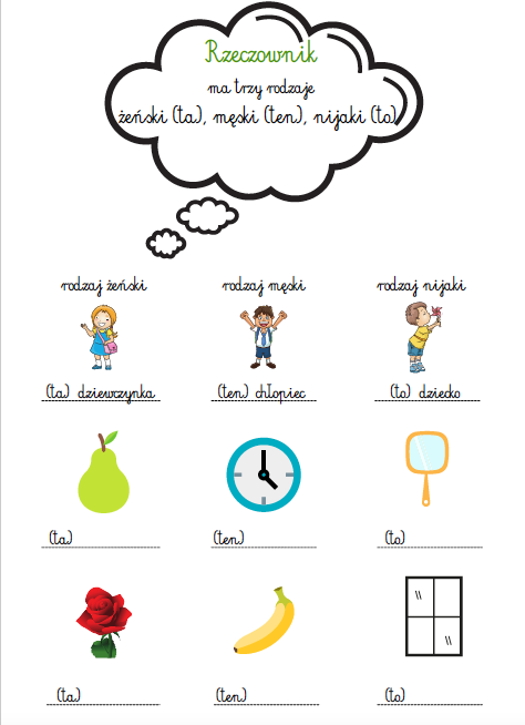 Karty pracy, format A4 oraz A5. Ćwiczenia, które pomogą uczniom opanować podstawowe wiadomości o rzeczowniku. W zestawie znajduje się także karta z samooceną, podsumowująca wiedzę ucznia.