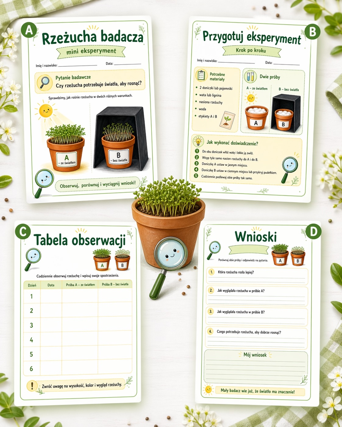 Przygotowałam 4-stronicowy materiał, który pomaga dzieciom przeprowadzić prosty eksperyment przyrodniczy z rzeżuchą. Uczniowie porównują dwie próby: rzeżuchę rosnącą ze światłem oraz rzeżuchę bez dostępu do światła.