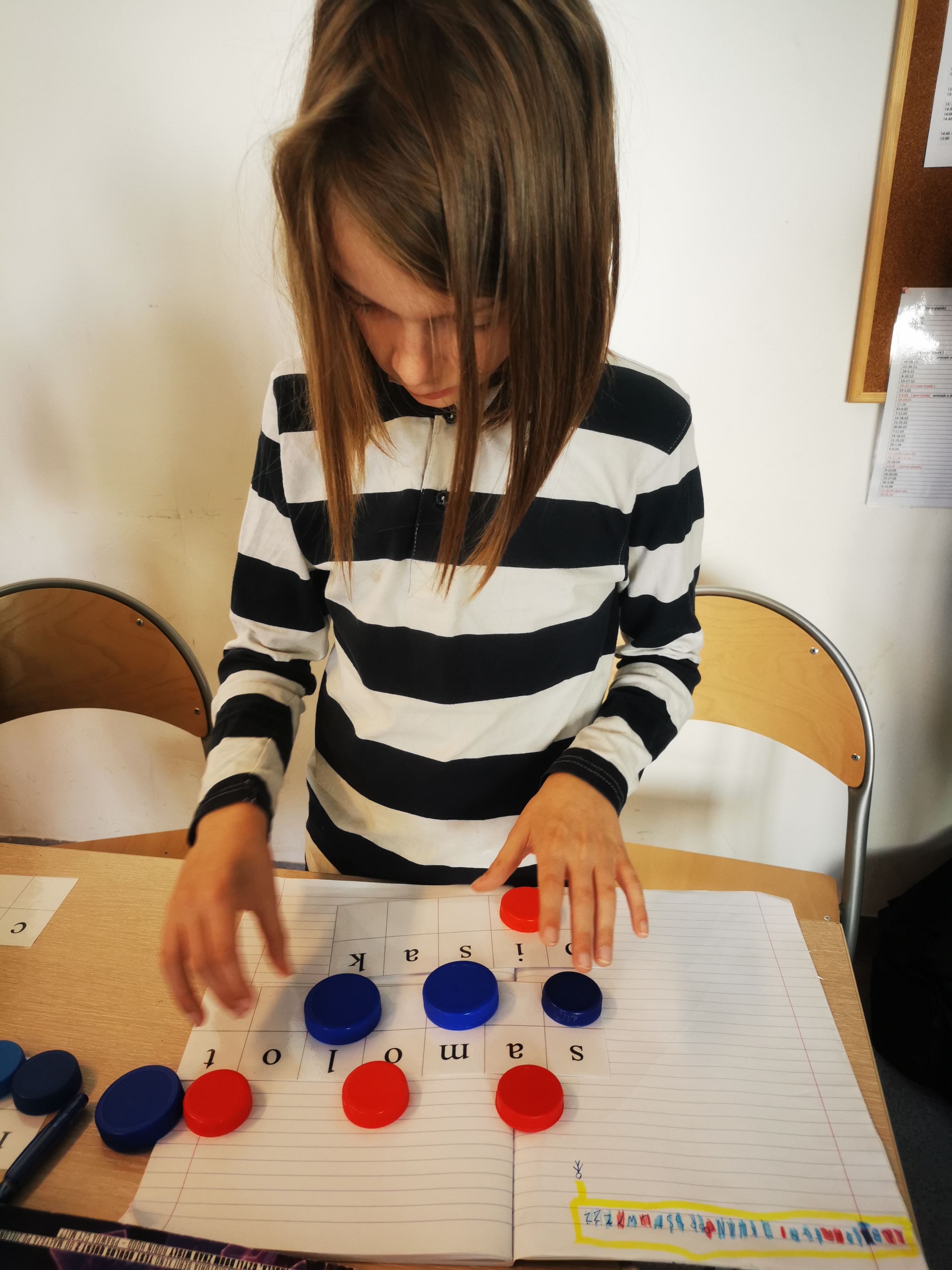 Można także kratki kolorować lub też przykładać kolorowe karteczki, jeśli nie mamy nakrętek.