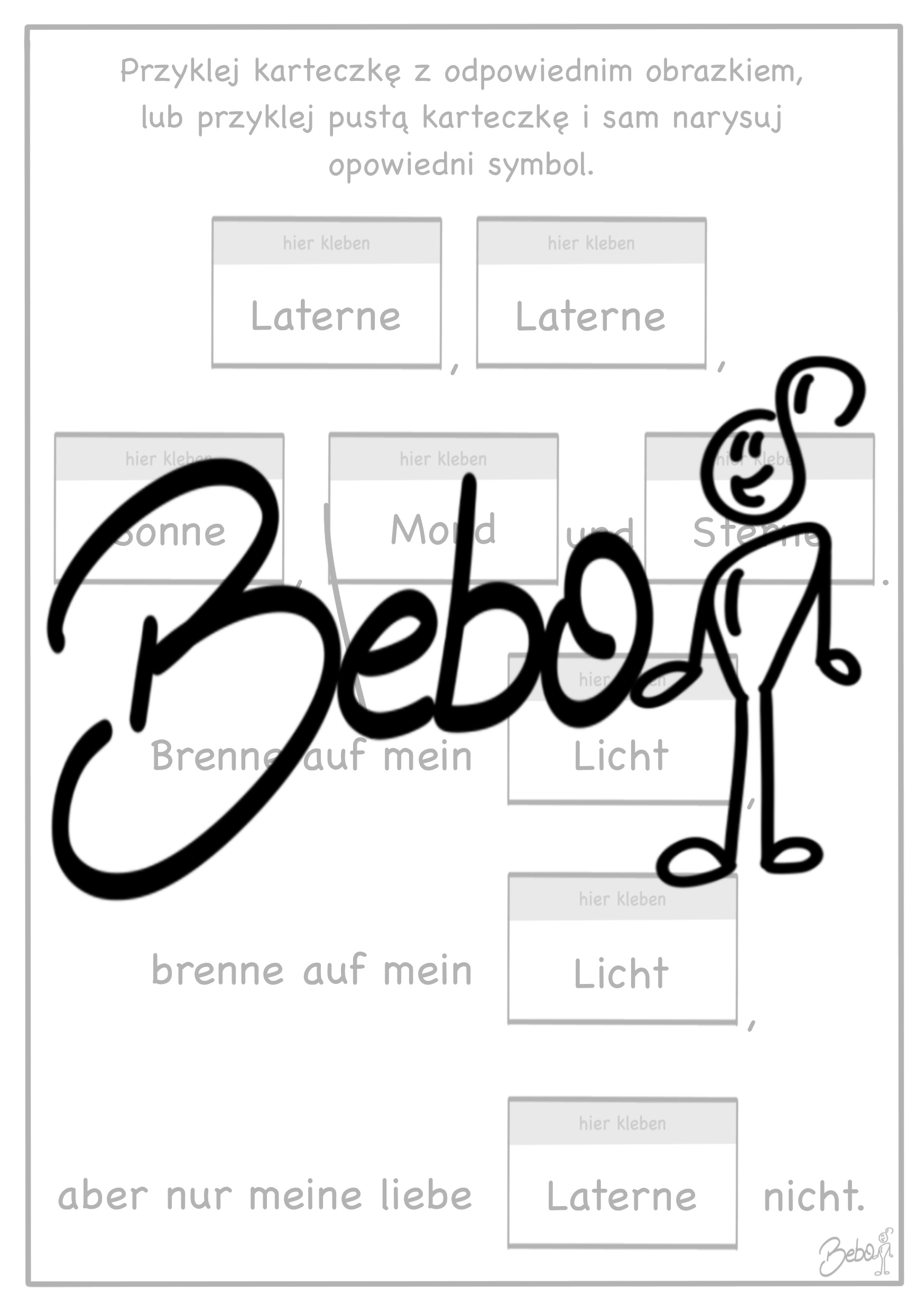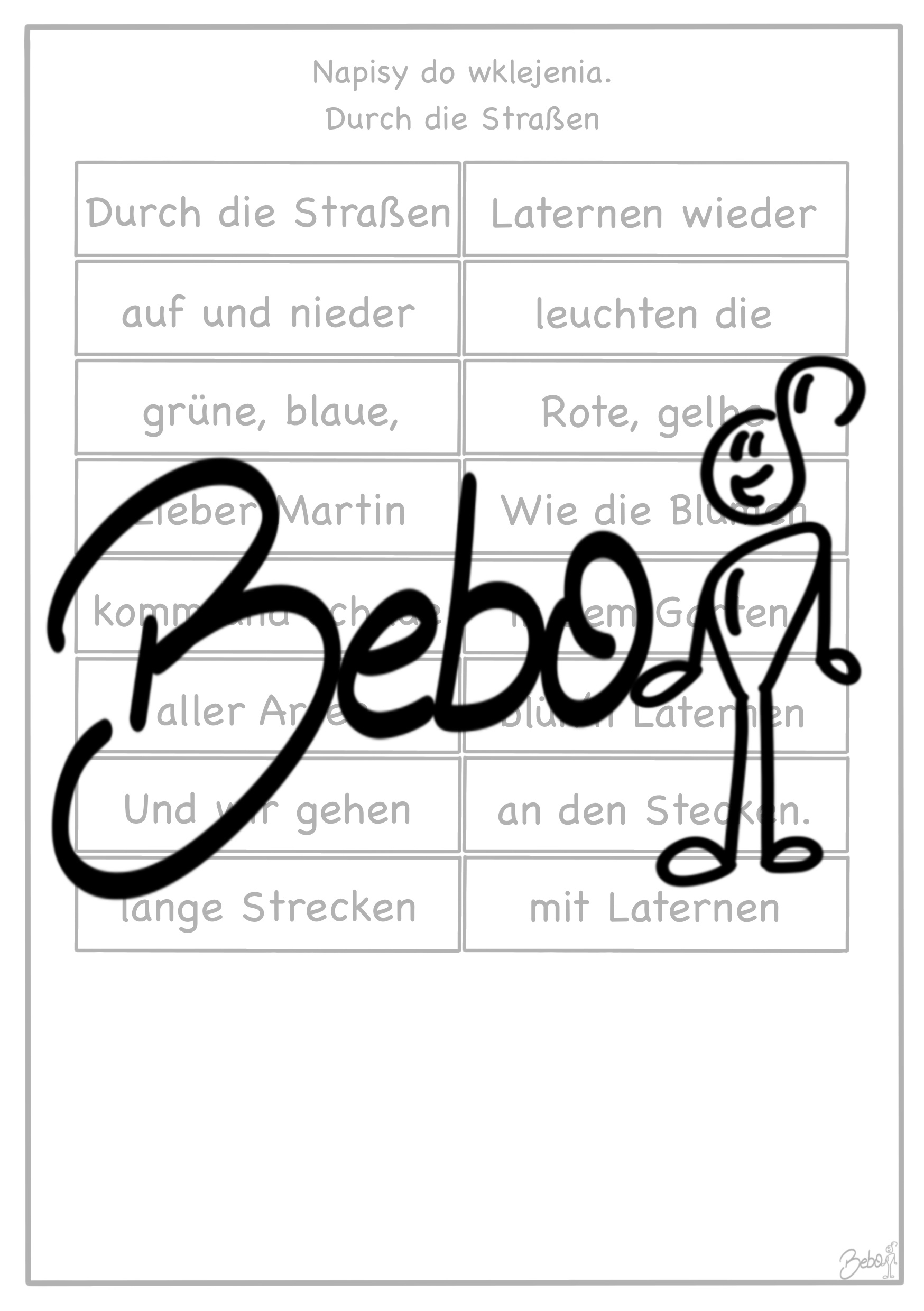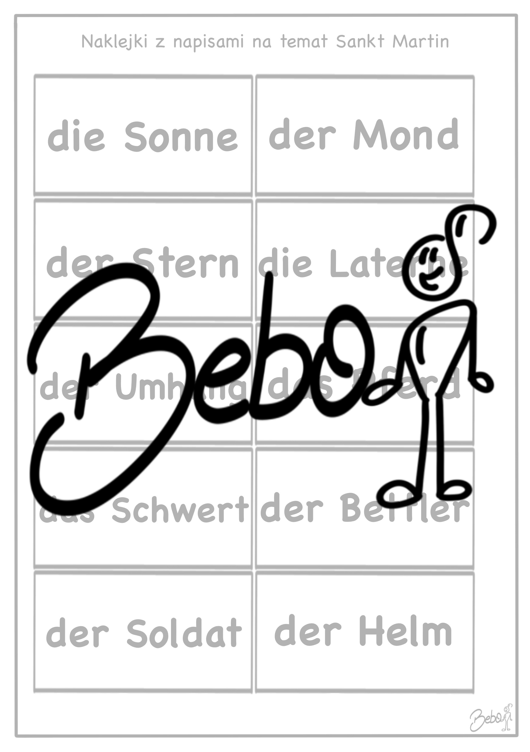 W pliku znajdują się materiały na temat wspomnienia świętego Marcina. Jest strona „słowniczkowa”, na której uczniowie rysują lub piszą znaczenie danego słowa, latarnia do pokolorowania, piosenkę „Laterne, Laterne” oraz „Durch die Straßen auf und nieder”, oraz minilapbook na temat dnia świętego Marcina.