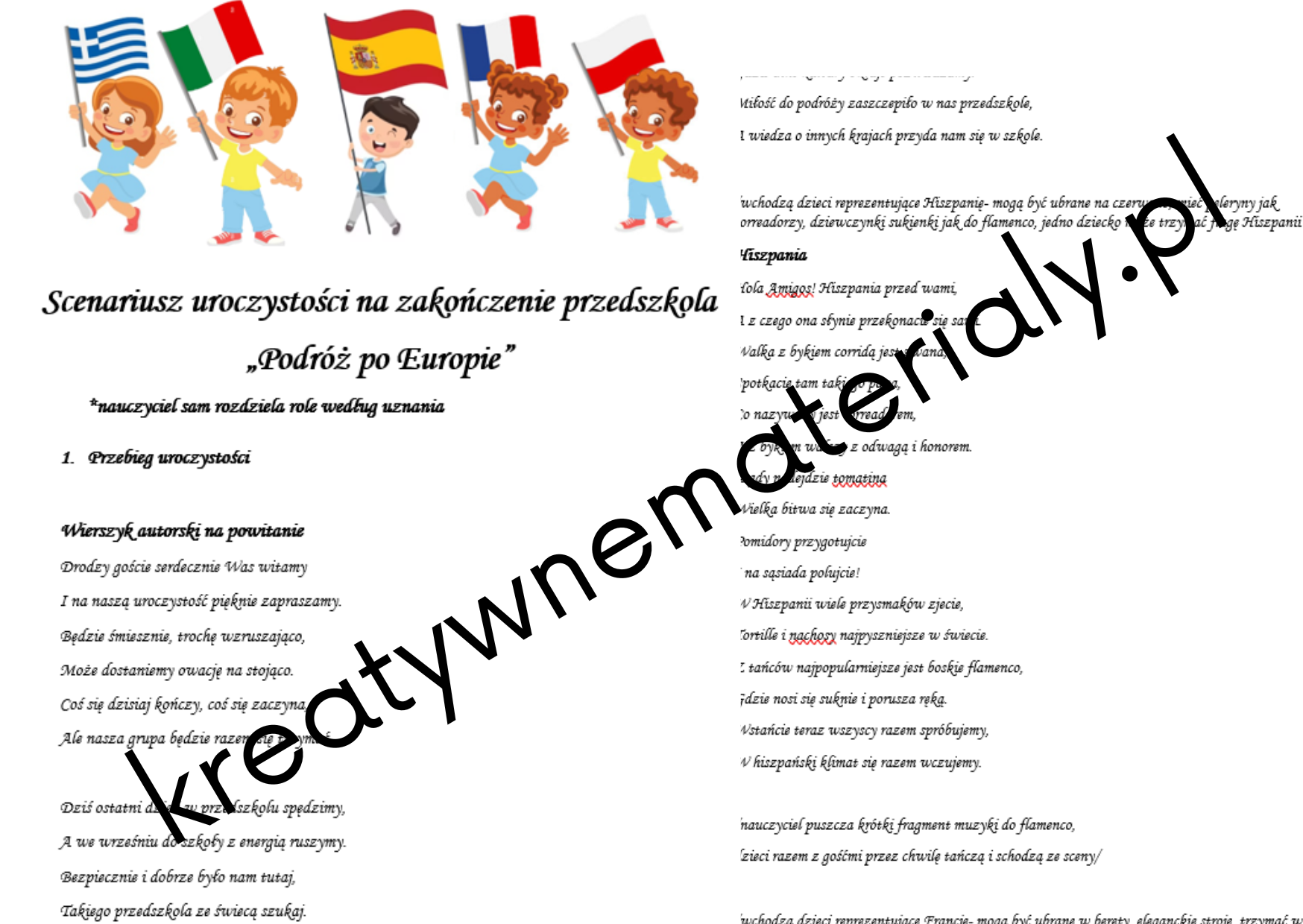 „Podróż po Europie” - dzieci odwiedzają najważniejsze europejskie kraje i opowiadają gościom, czego się o nich nauczyły w przedszkolu; wykonują przy tym piosenki i tańce związane z różnymi krajami. Między innymi: hiszpańskie flamenco, grecka zorba, polski polonez, a także piosenka „Nie płacz Pani/Ciociu” z autorskim tekstem do melodii piosenki „Nie płacz Ewka” zespołu Perfect.