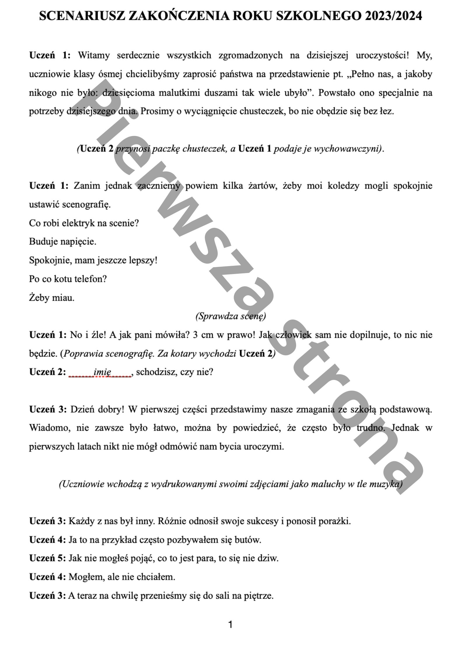 Scenariusz napisałam i wykorzystałam na zakończenie roku szkolnego 2023/2024. Przeznaczony jest dla 10 uczniów. Zawiera sceny z klas 1-3, klas 4-8 i rozdanie Oskarów. Jest dowcipny, ale także wzruszający.