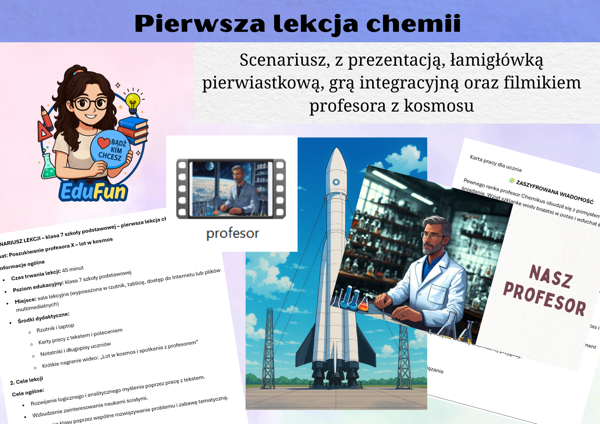 Ten scenariusz to nie tylko lekcja – to pełna emocji wyprawa w kosmos, podczas której uczniowie wcielają się w młodych naukowców próbujących odnaleźć zaginionego profesora Chemikusa. W toku zabawy rozwiązują zagadkę chemiczną, uczą się rozpoznawać pierwiastki, a przy okazji integrują się jako zespół badawczy.