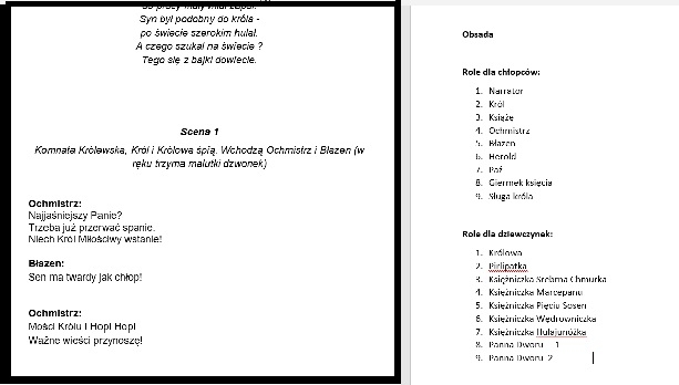 Scenariusz przedstawienia "Księżniczka na ziarnku grochu", z podziałemn na role.