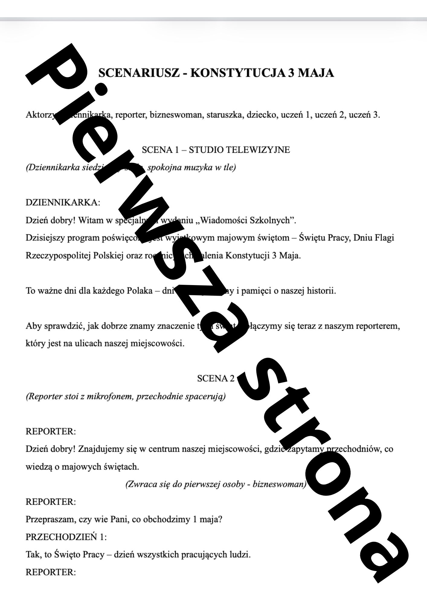 Scenariusz składa się z 5 scen i 2 piosenek (każdy musi wybrać sam). Oparty jest na pracy 8 uczniów. Występuje dziennikarka, reporter, bizneswoman, staruszka, dziecko i troje uczniów w strojach galowych. Przedstawienie jest krótkie, ale zawiera wszystkie niezbędne elementy dot. świąt majowych.