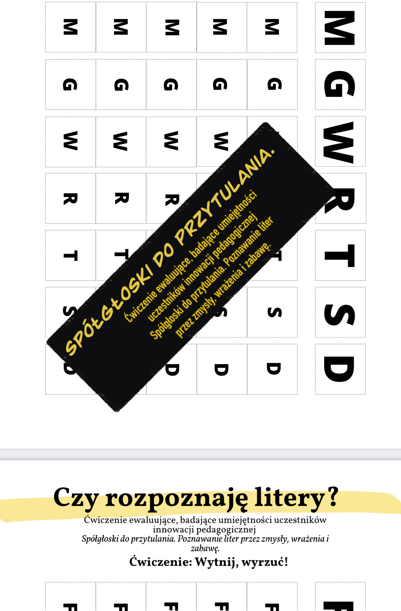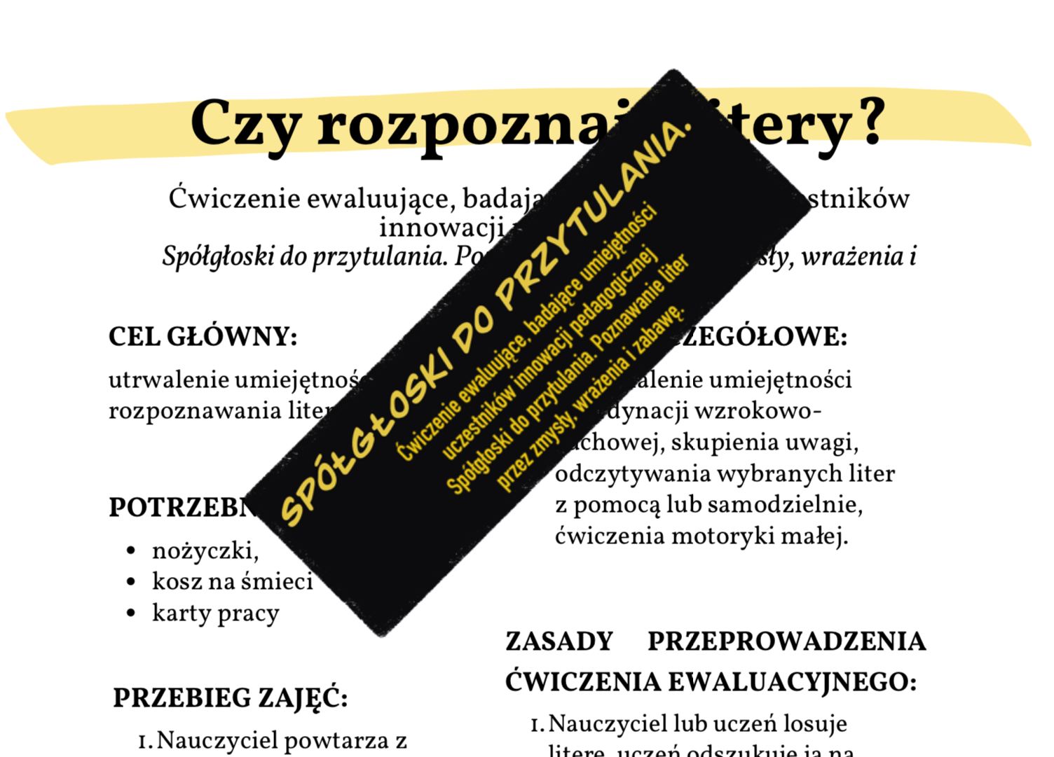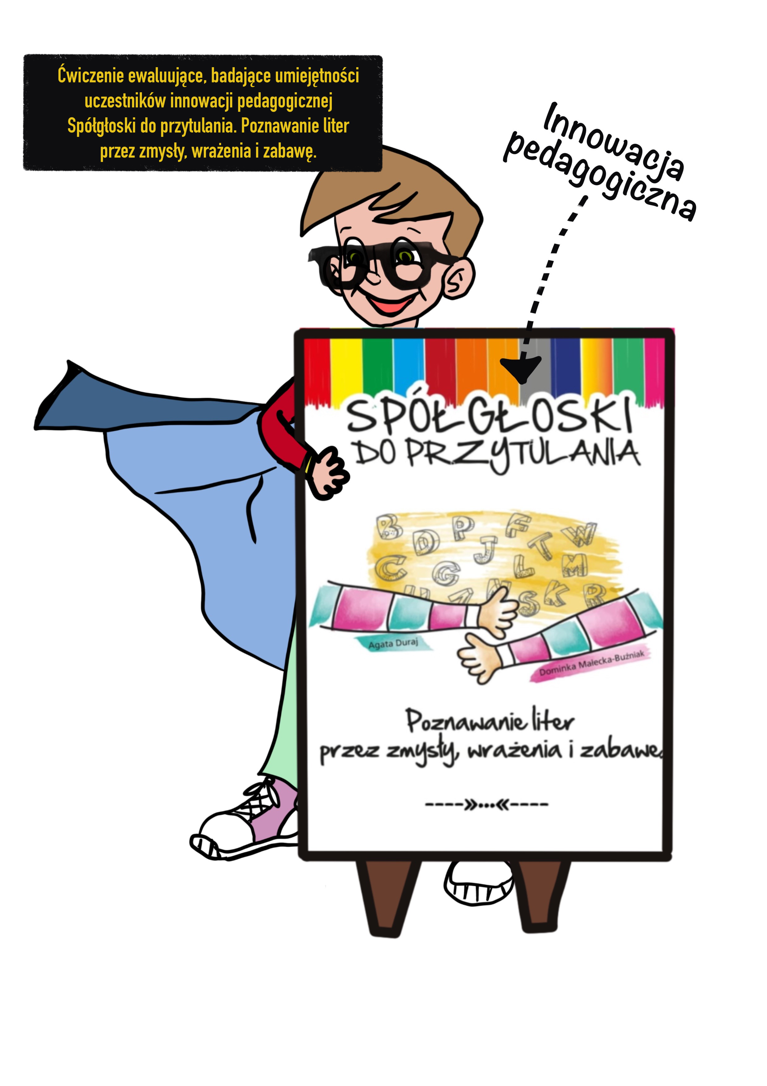 Scenariusz zajęć. Ćwiczenie ewaluujące, badające umiejętności uczestników w zakresie rozpoznawania spółgłosek w ramach innowacji pedagogicznej Spółgłoski do przytulania. Poznawanie liter przez zmysły, wrażenia i zabawę. Scenariusz i karty pracy.