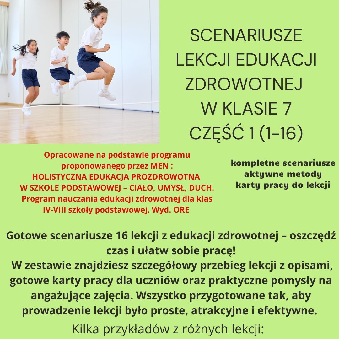 W zestawie znajdziesz szczegółowy przebieg lekcji z opisami, gotowe karty pracy dla uczniów oraz praktyczne pomysły na angażujące zajęcia. Wszystko przygotowane tak, aby prowadzenie lekcji było proste, atrakcyjne i efektywne.Opracowano w oparciu o m.in. zasoby internetu oraz sztucznej inteligencji, dzięki którym scenariusze cechuje logika, prostota wyjaśnianych zagadnień oraz dostosowanie do wieku uczniów. Nauczycielu, opracuj materiały sam lub oszczędź czas i ułatw sobie pracę! Rozkład materiału w oparciu o program proponowany przez MEN: HOLISTYCZNA EDUKACJA PROZDROWOTNA W SZKOLE PODSTAWOWEJ – CIAŁO, UMYSŁ, DUCH. Program nauczania edukacji zdrowotnej dla klas IV-VIII szkoły podstawowej.
