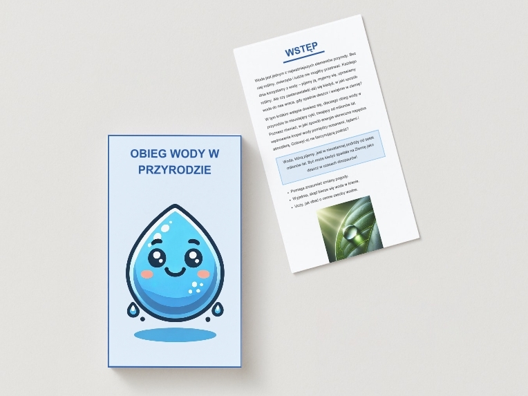 Poznaj krótki, zwięzły, a zarazem atrakcyjny wizualnie materiał edukacyjny o obiegu wody w przyrodzie! Nasz 4-stronicowy zestaw zawiera: