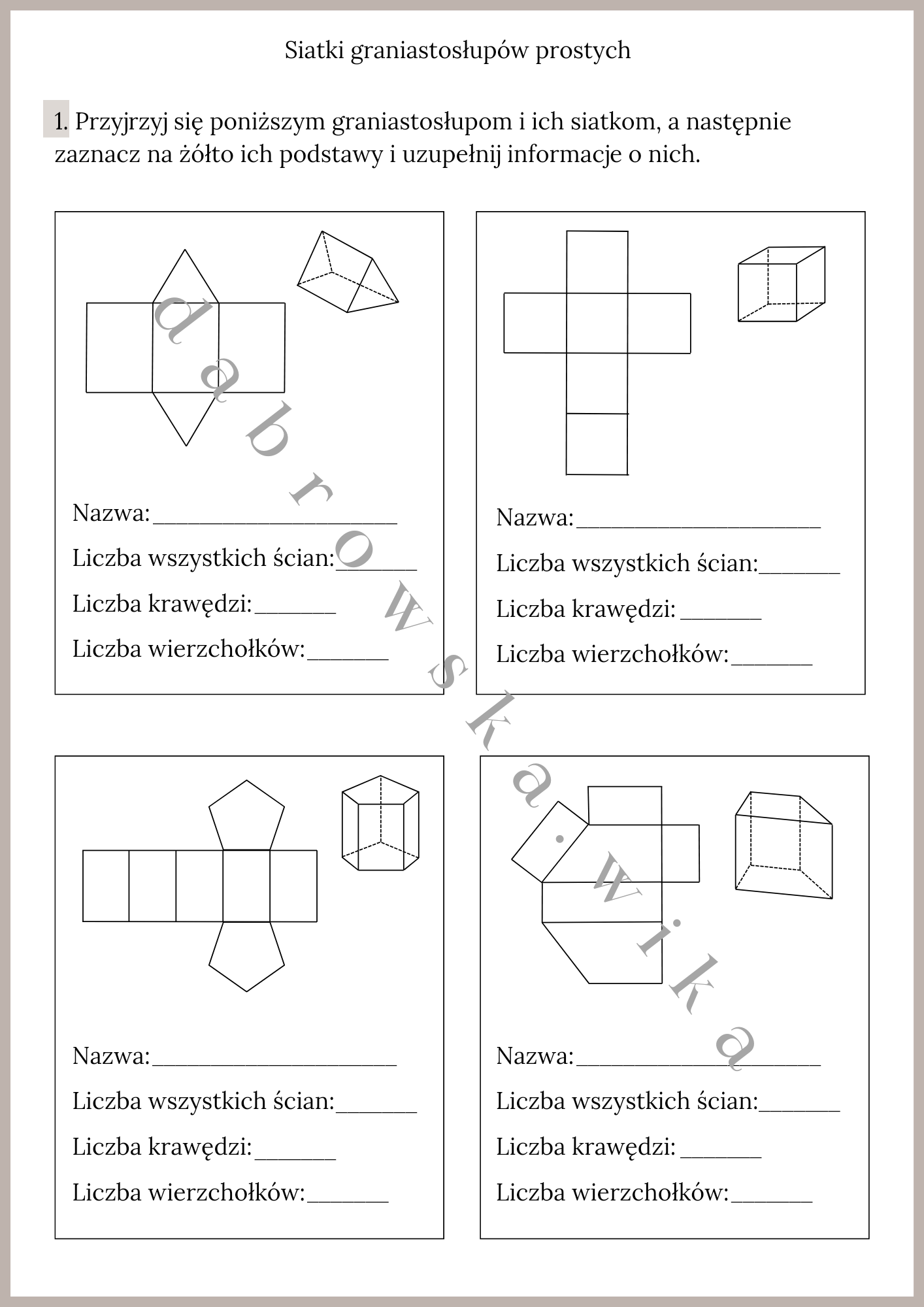 Na ucznia czekają dwa zadania. W zadaniu pierwszym znajduje się 6 przykładów graniastosłupów prostych i ich siatek. Należy zaznaczyć na żółto ich podstawy oraz uzupełnić informacje poniżej.