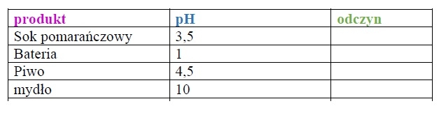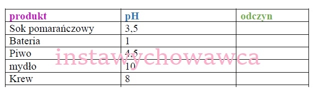 Karta pracy zawiera tabelkę, w której podana jest nazwa produktu oraz jego wartość pH. Zadaniem ucznia jest wpisanie do tabelki odczynu (pod tabelką znajduje się ściąga). Na kartce A4 znajdują się dwie takie same tabelki.