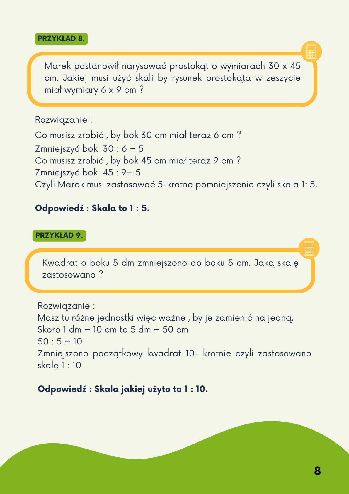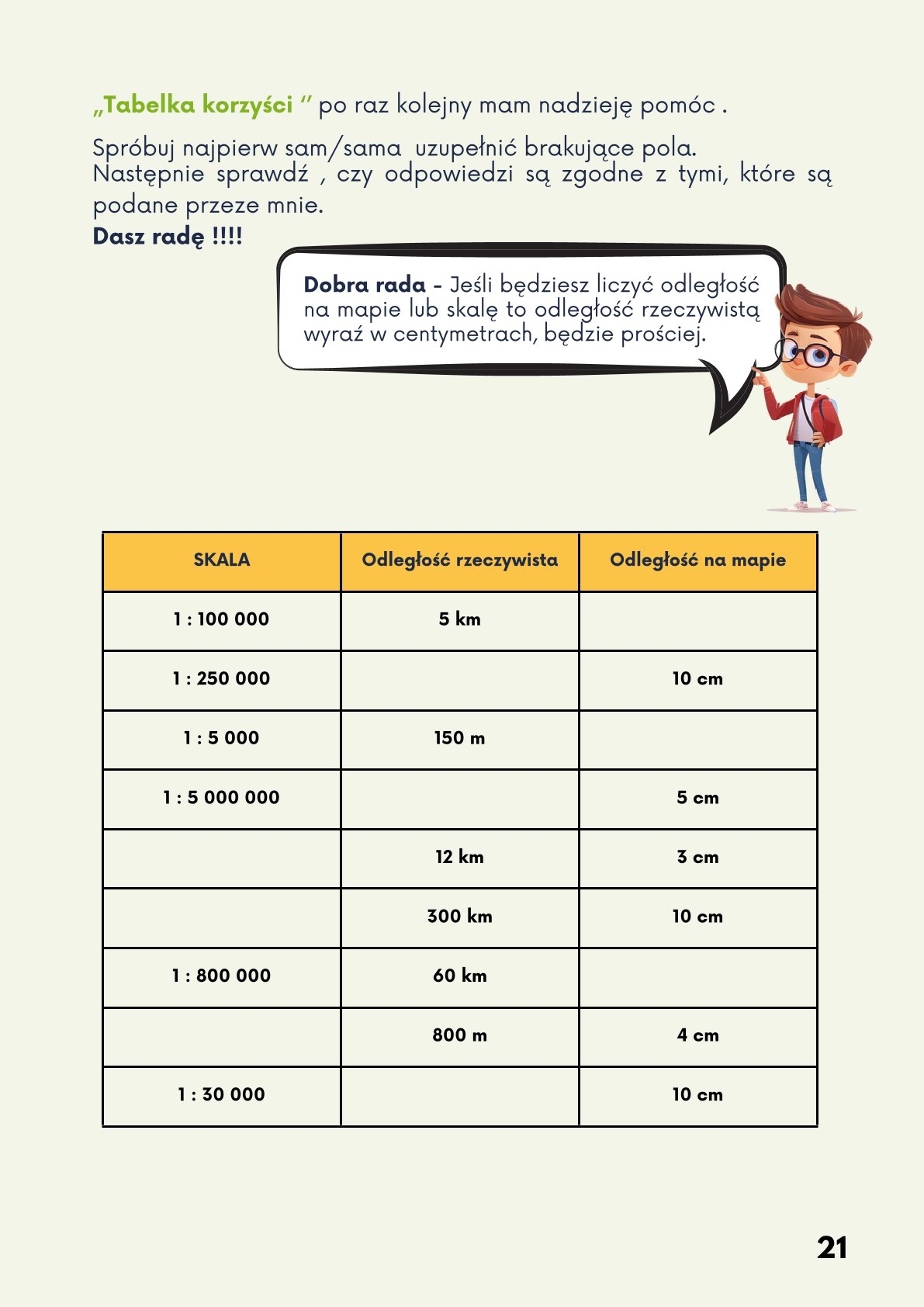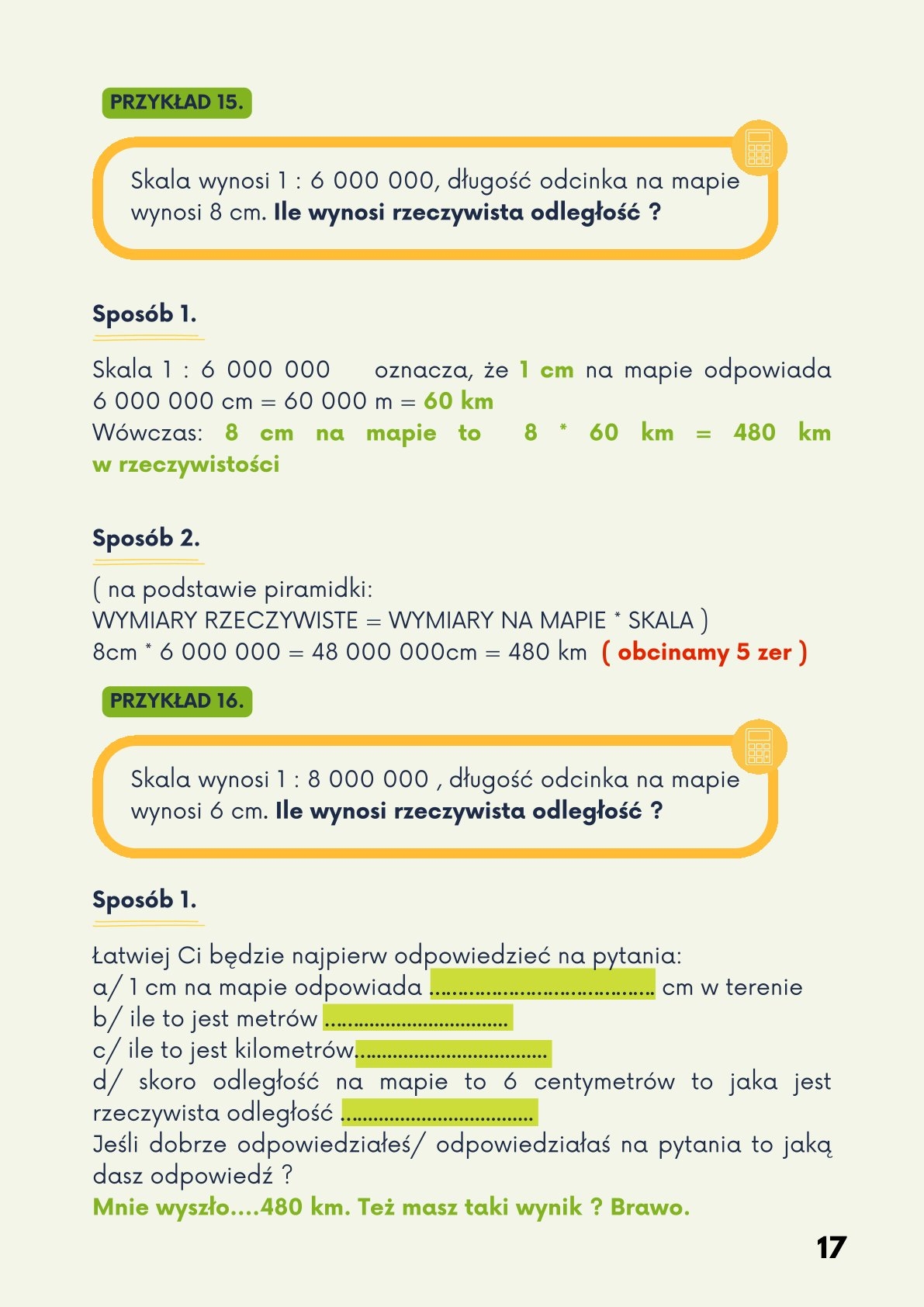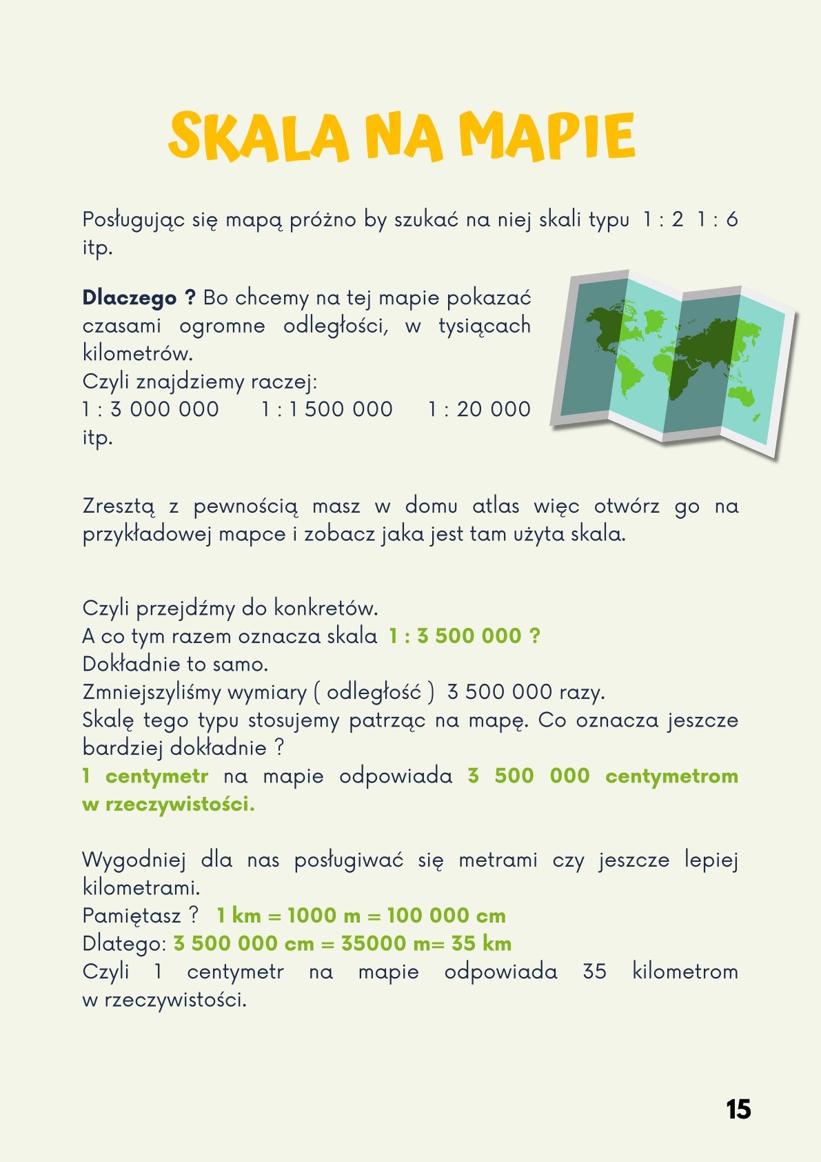 Kiedy coś powiększamy, coś pomniejszamy- zawsze używamy skali. Ale uczniowie największy problem mają ze skalą stosowaną na mapie. Dla wielu z nich zapis np. 1: 1 000 000 budzi obawy. W e-booku wszystko to wyjaśnione jest w prosty, przejrzysty sposób. Od tej pory obliczanie odległości w terenie, odległości na mapie to żaden problem. Obiecuję. Niezbędna teoria, liczne rozwiązane przykłady oraz zadania do samodzielnego rozwiązania – 22 zadania - ( też od CKE ) opatrzone odpowiedziami. Kolorowo, przystępnie, ciekawie. E-book zawiera 39 stron. Nudzić się nie będziesz.