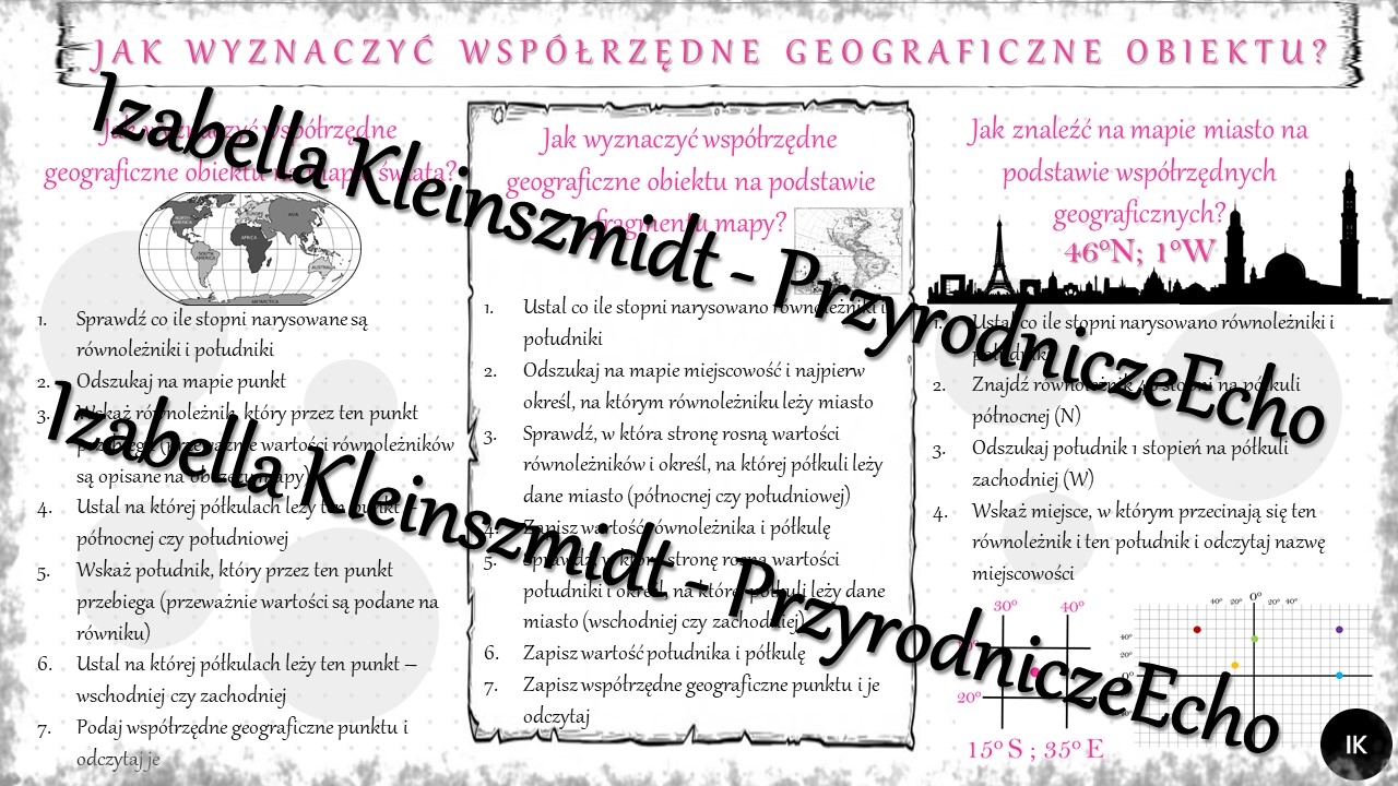 Sketchnotka - notatka „Ćwiczenia w określaniu współrzędnych geograficznych” wykonana w power point do edycji. Geografia 6; „Współrzędne geograficzne”