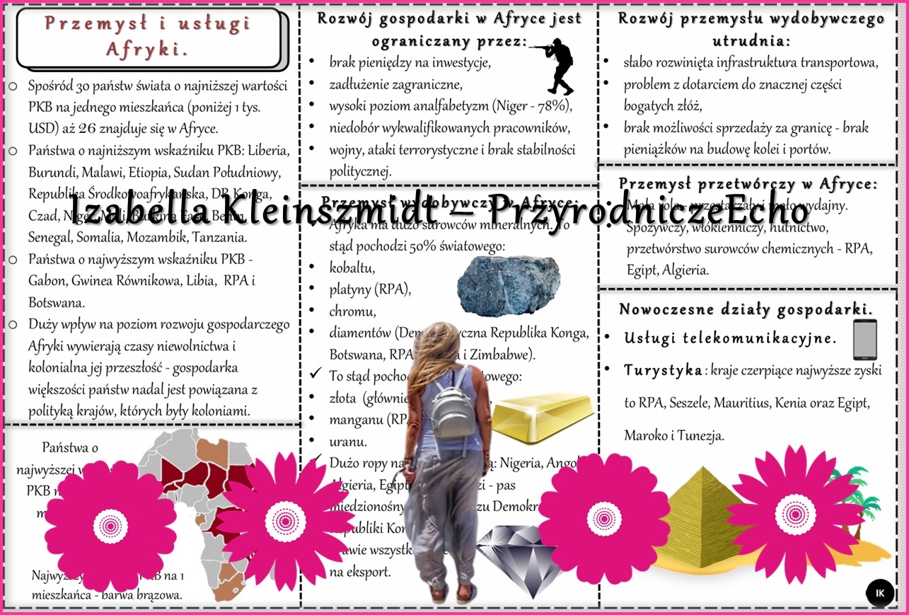 Sketchnotka/książeczka/notatka/wklejka/ściąga dla ucznia i przypomnienie dla nauczyciela/edukacja domowa. Temat „Przemysł i usługi w Afryce”. Materiał w pdf. Geografia 8, dział „Afryka”. Nowość 2024/2025.