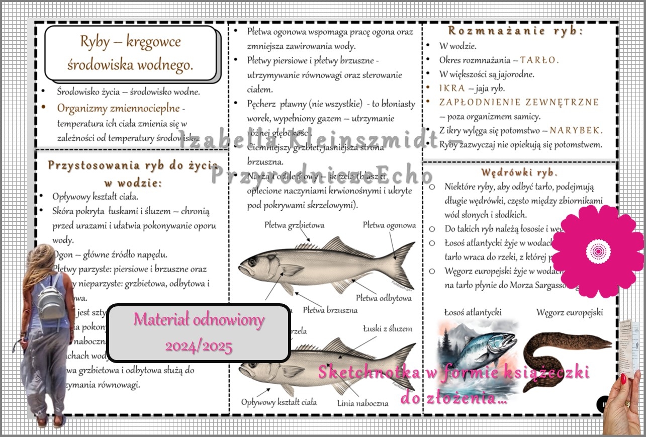 Sketchnotka/książeczka/notatka/wklejka/ściąga dla ucznia i przypomnienie dla nauczyciela/edukacja domowa. Temat „Ryby-kręgowce środowiska wodnego”. Materiał w pdf. Biologia 6, dział „Kręgowce zmiennocieplne”. Nowość 2024/2025.