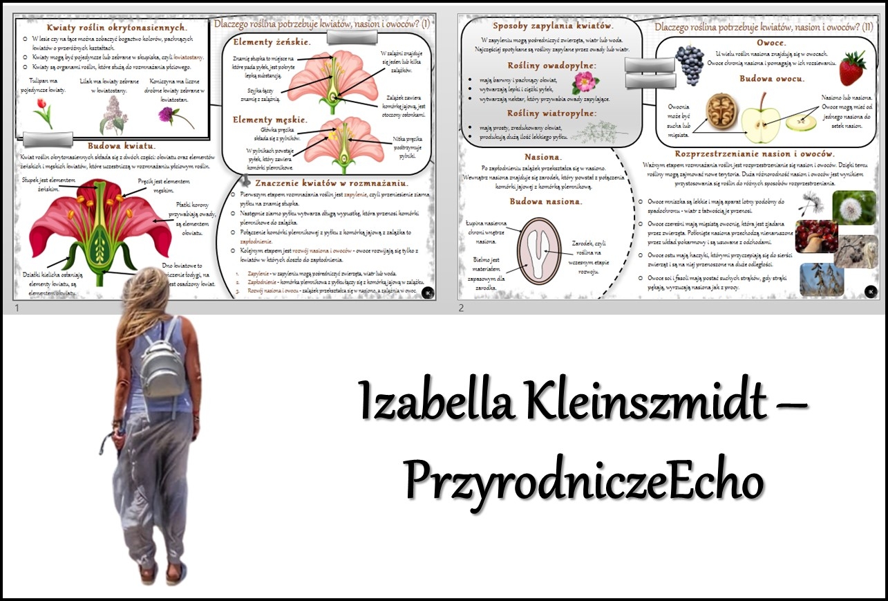 Witajcie Nazywam się Izabella Kleinszmidt (PrzyrodniczeEcho). Jestem nauczycielem przyrody, biologii, geografii i chemii w szkole podstawowej w Pomysku Wielkim. Uwielbiam mój zawód i cieszę się, że robię w życiu to co kocham. Pasja dla nauczyciela jest bardzo ważna:). Prowadzę stronę PrzyrodniczeEcho na FB, nagrywam filmiki do lekcji, konstruuję prezentacje i lekcje multimedialne, escape roomy oraz sketchnotki i karty pracy w programie power point. Zapraszam na stronę internetową mojej szkoły, gdzie znajdują się (niektóre darmowe) opracowania lekcji do przyrody, biologii, geografii i chemii w SP. Adres strony internetowej: https://sppomyskwielki.edu.pl - zakładka - dla ucznia. Od niedawna zapraszam również na moją stronę internetową: https://ikleinszmidt.wixsite.com/przyrodniczeecho Zapraszam do korzystania z mojej pracy:) Bardzo proszę również czytać opisy, aby wiedzieć, jaki materiał znajduje się w danym pliku. Zachęcam do kontaktu w razie jakichś pytań lub błędów w pomocach - brakach lub literówkach-wszystko można naprawić? Jakich materiałów możecie Państwo oczekiwać? SKETCHNOTKA - notatka kompletna z określonego tematu KARTA PRACY - zazwyczaj sketchnotka z wykropkowanymi miejscami PREZENTACJA MULTIMEDIALNA - kompletne wiadomości do odpowiedniego tematu wraz z grafiką i tekstem - zarówno w power point jak i genially - tę koniecznie należy zapisać na swoim koncie! LEKCJA MULTIMEDIALNA - pomysł na przeprowadzenie lekcji - taki "tok lekcji" - skrócony scenariusz ZESTAWY - proszę się wczytać w opis, informuję co mieści się w konkretnym zestawie:) Pozdrawiam cieplutko:)