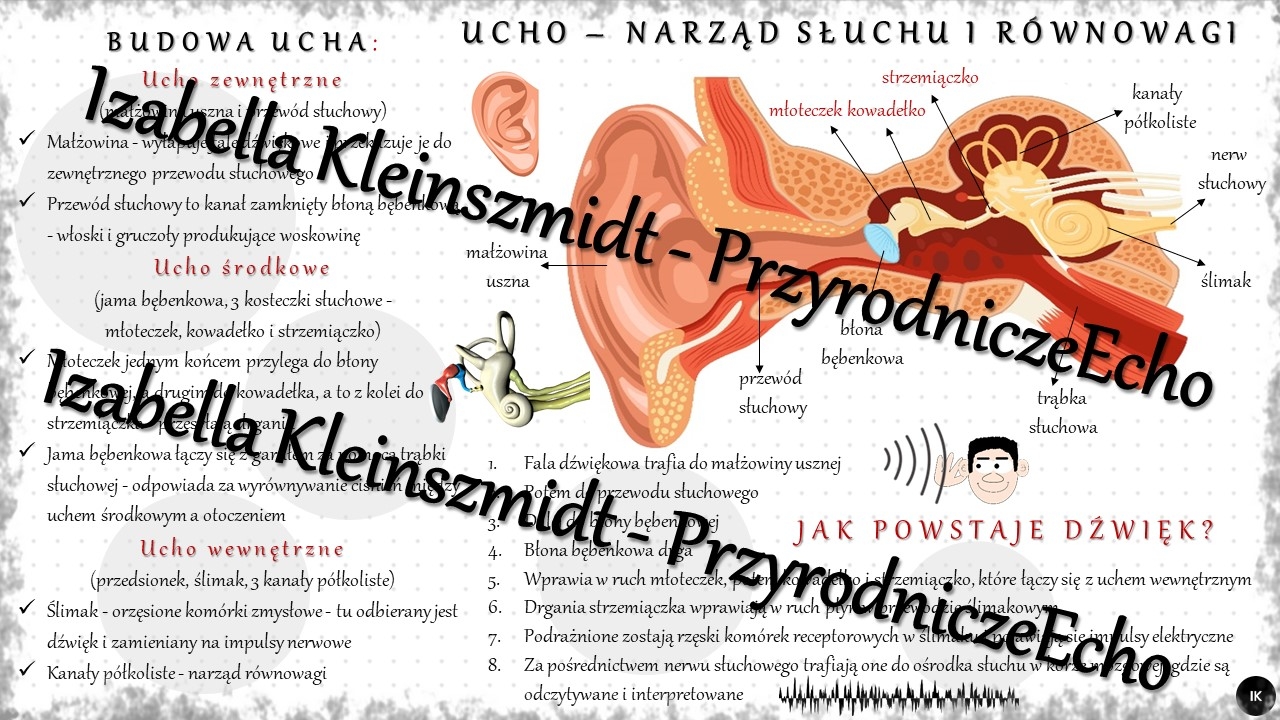 Sketchnotka - notatka „Ucho - narząd słuchu i równowagi” wykonana w power point do edycji. Biologia 7; „Narządy zmysłów”