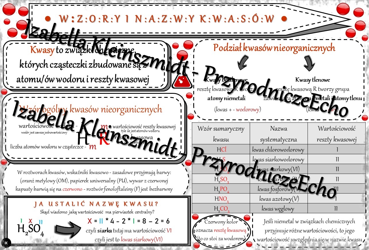 Sketchnotka - notatka „Wzory i nazwy kwasów” wykonana w power point do edycji. Chemia 7 lub 8, „Kwasy”