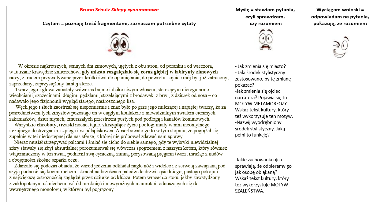 1. Poznanie treści lektury (nauczona doświadczeniem wiem, że trudno jest przekonać uczniów do czytania, dlatego coraz częściej czytamy w czasie lekcji - fakt, jest to czasochłonne, ale przynosi efekty. W pierwszej kolumnie tabeli znajduje się tytułowe opowiadanie - wycięłam tylko krótkie fragmenty).