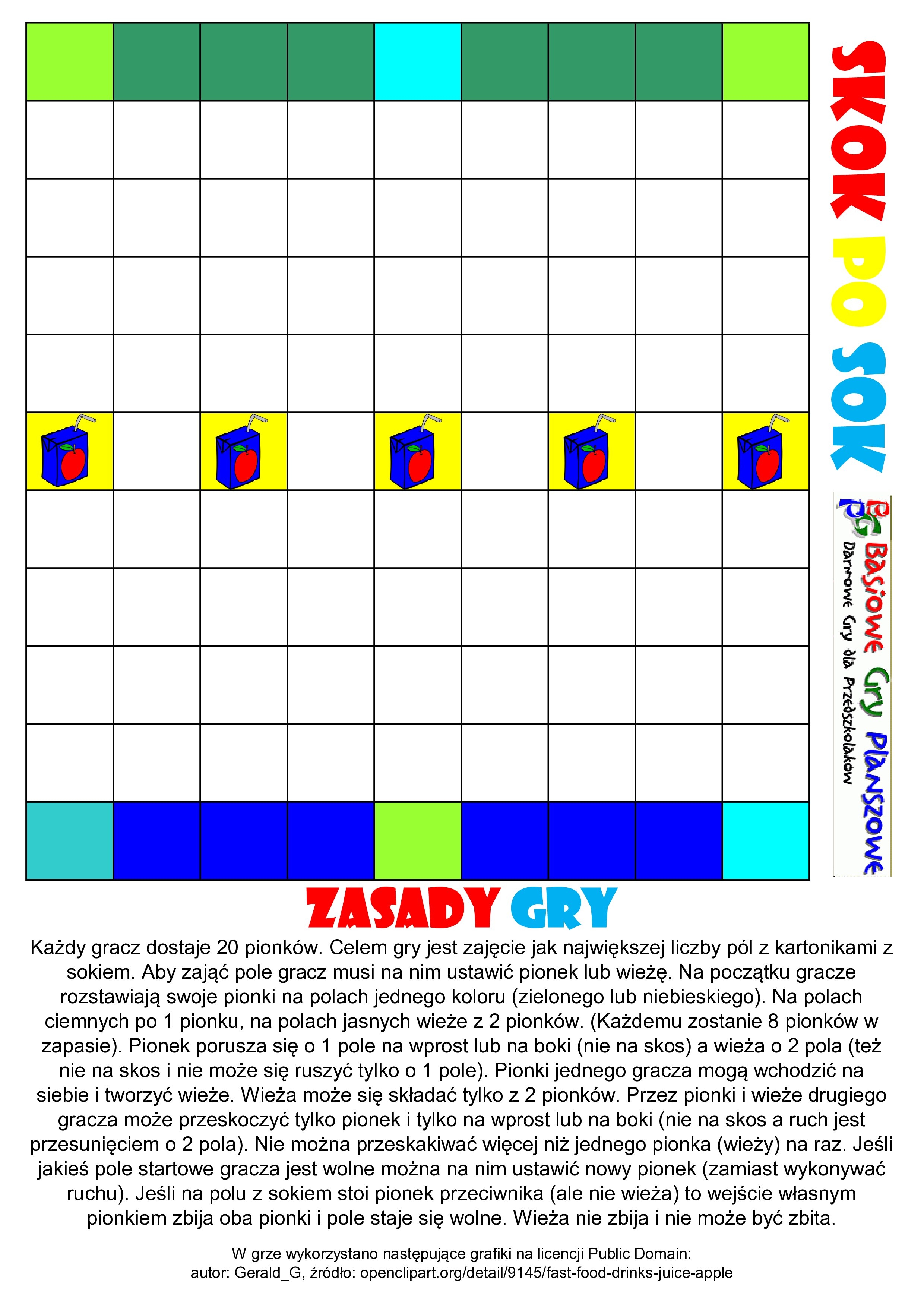 Skok po sok to wyścig w przejmowaniu terenu. Dwóch graczy stara się pozyskać dla siebie jak najwięcej pojemników z sokiem.