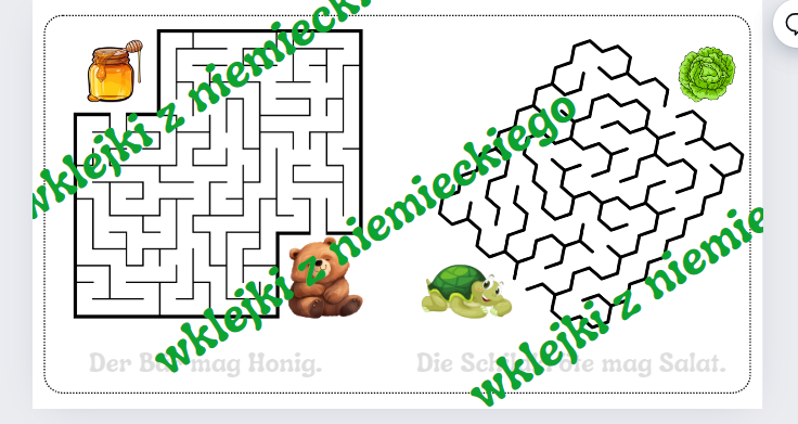 Labirynty wraz ze zdaniami w języku niemieckim, np. Die Katze mag Fisch. Pisanie po śladzie.