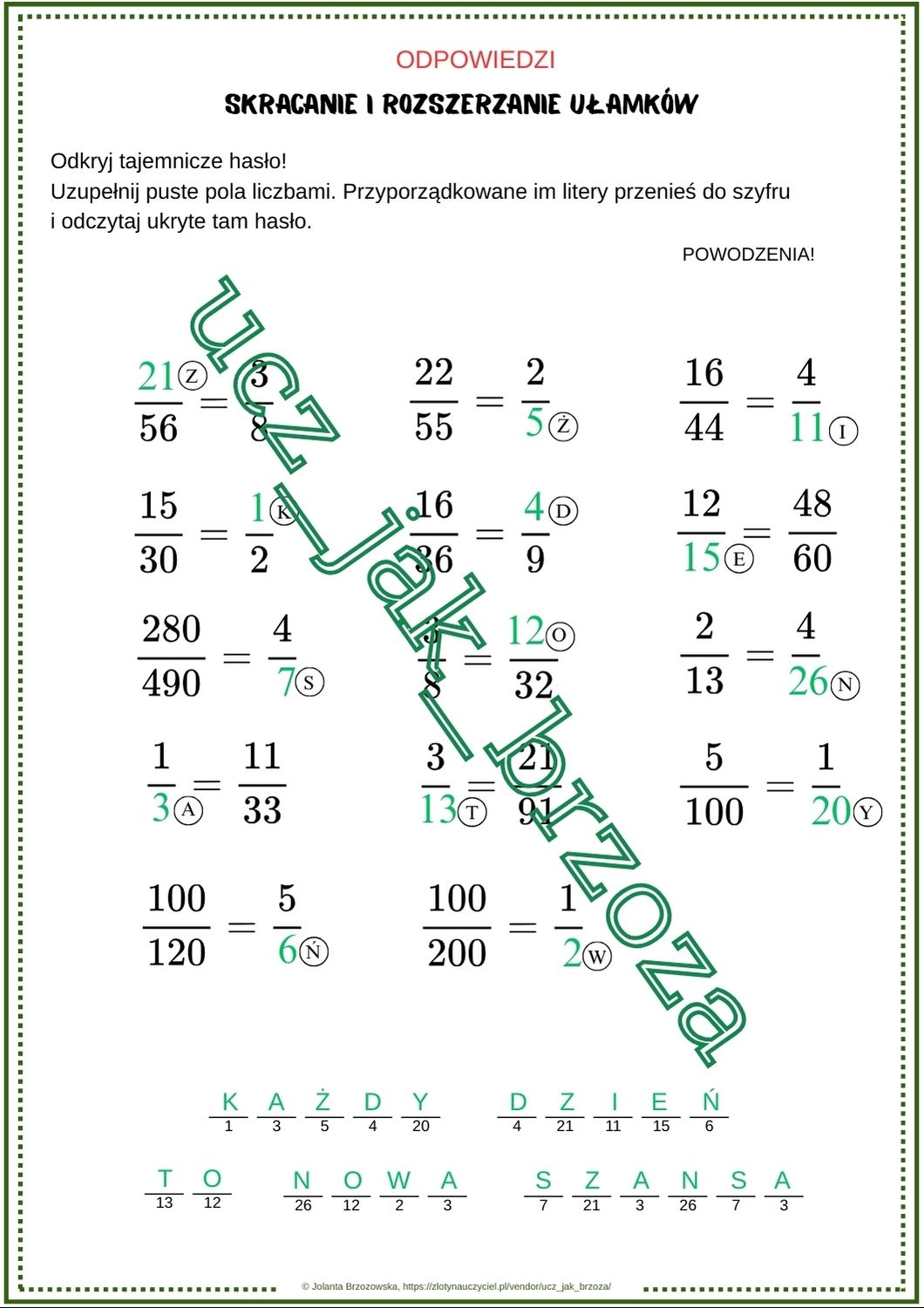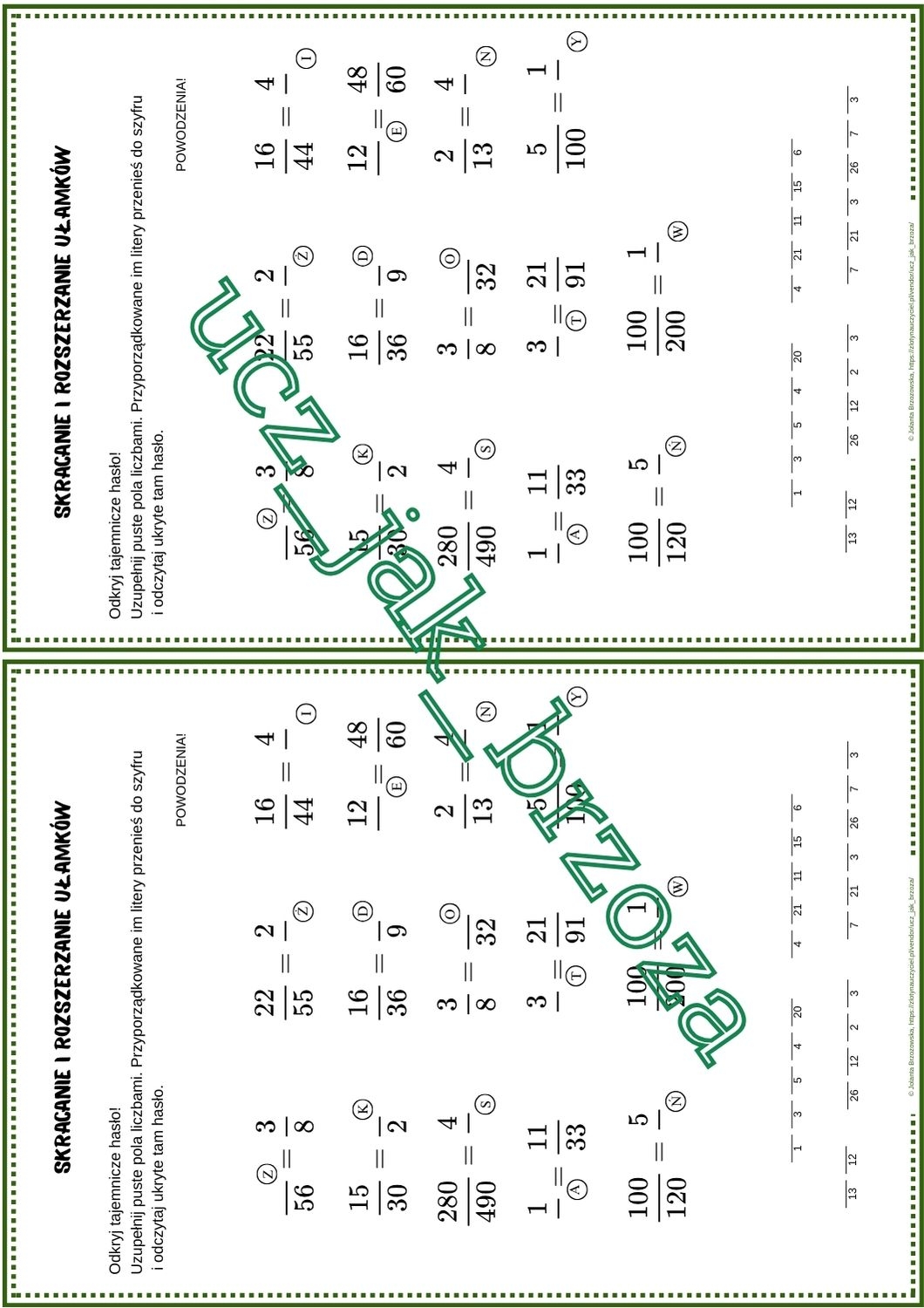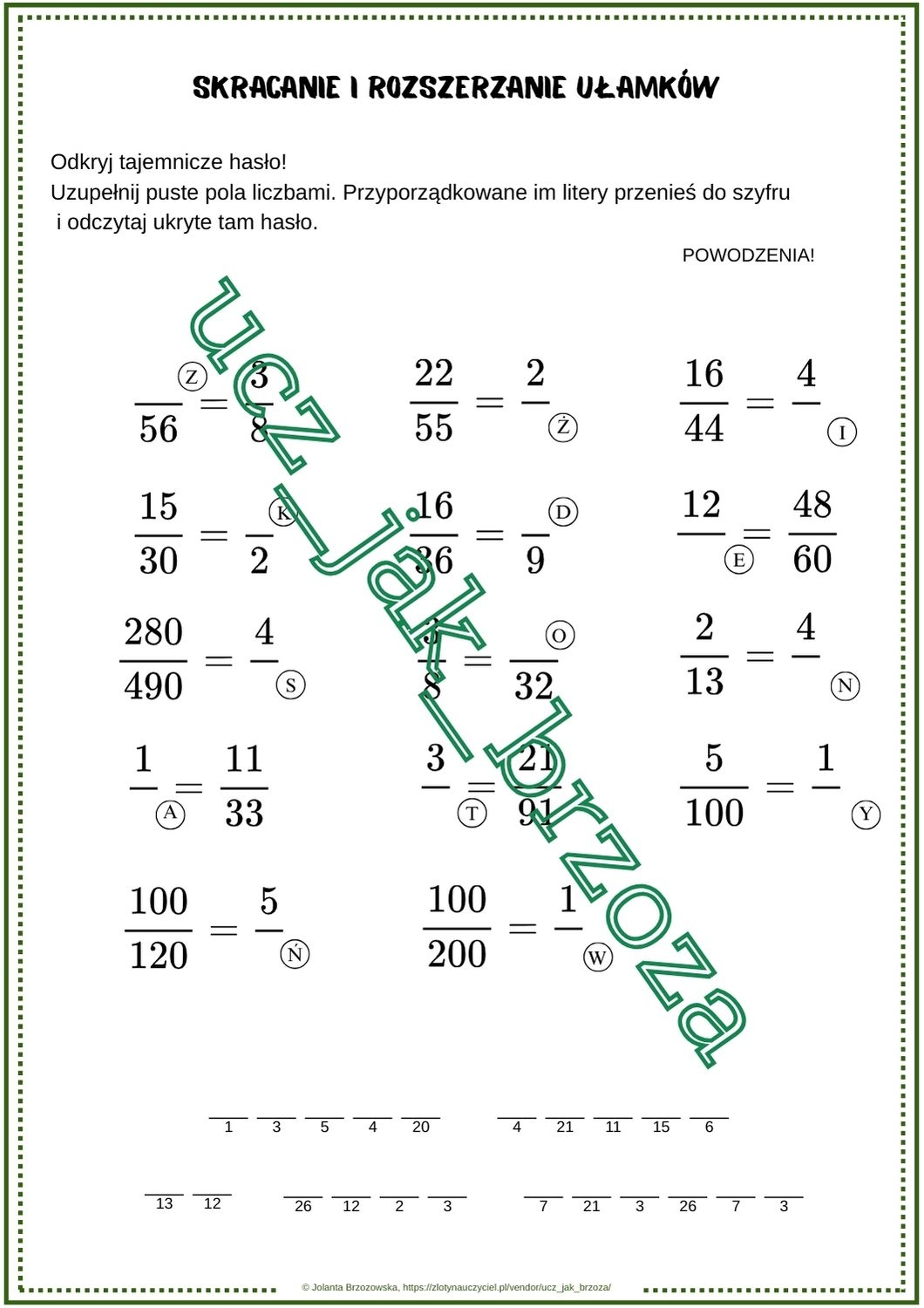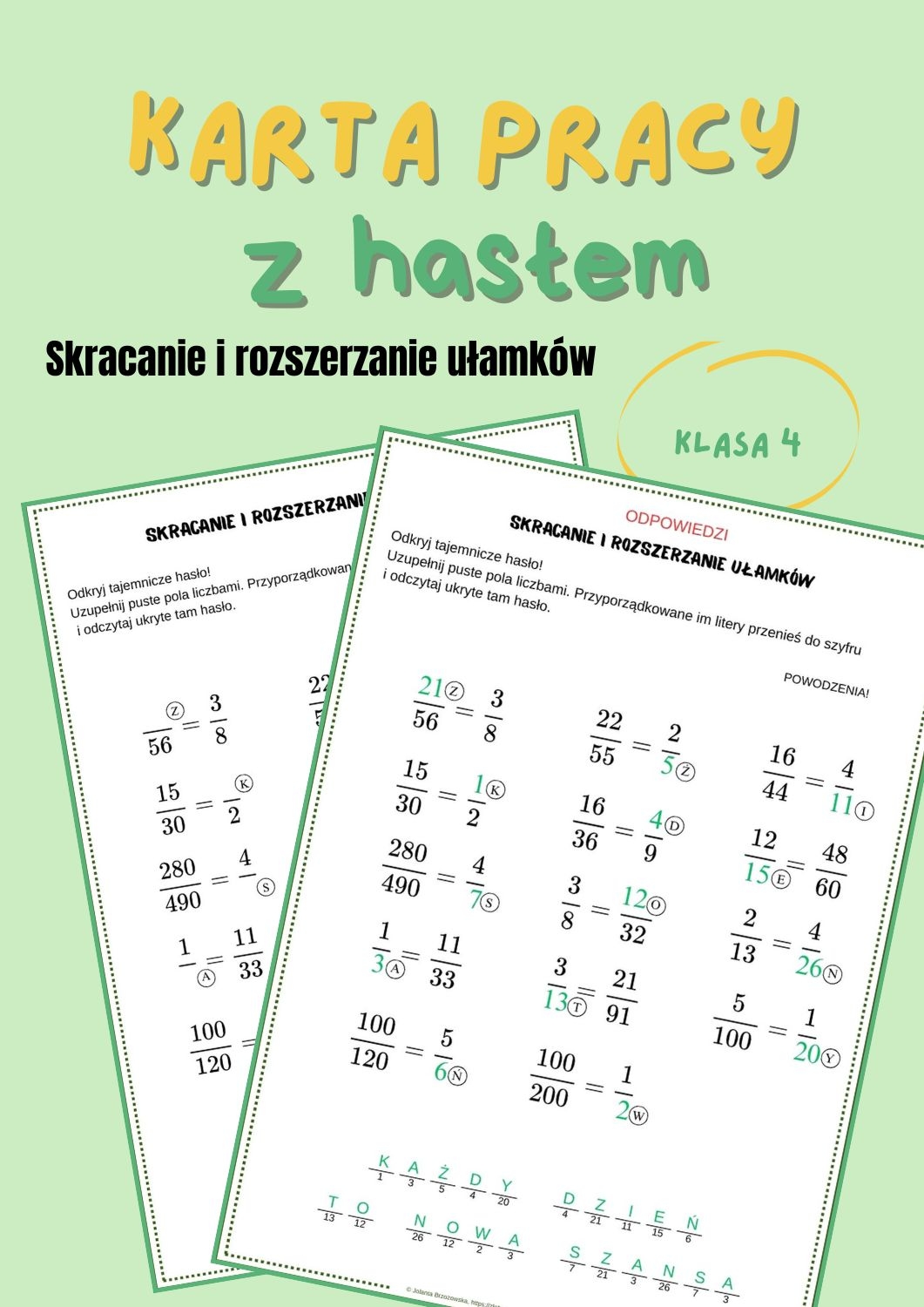 Karta pracy zawiera 14 przykładów na rozszerzanie i skracanie ułamków. Dodatkowo zawiera ukryte hasło do odkodowania.