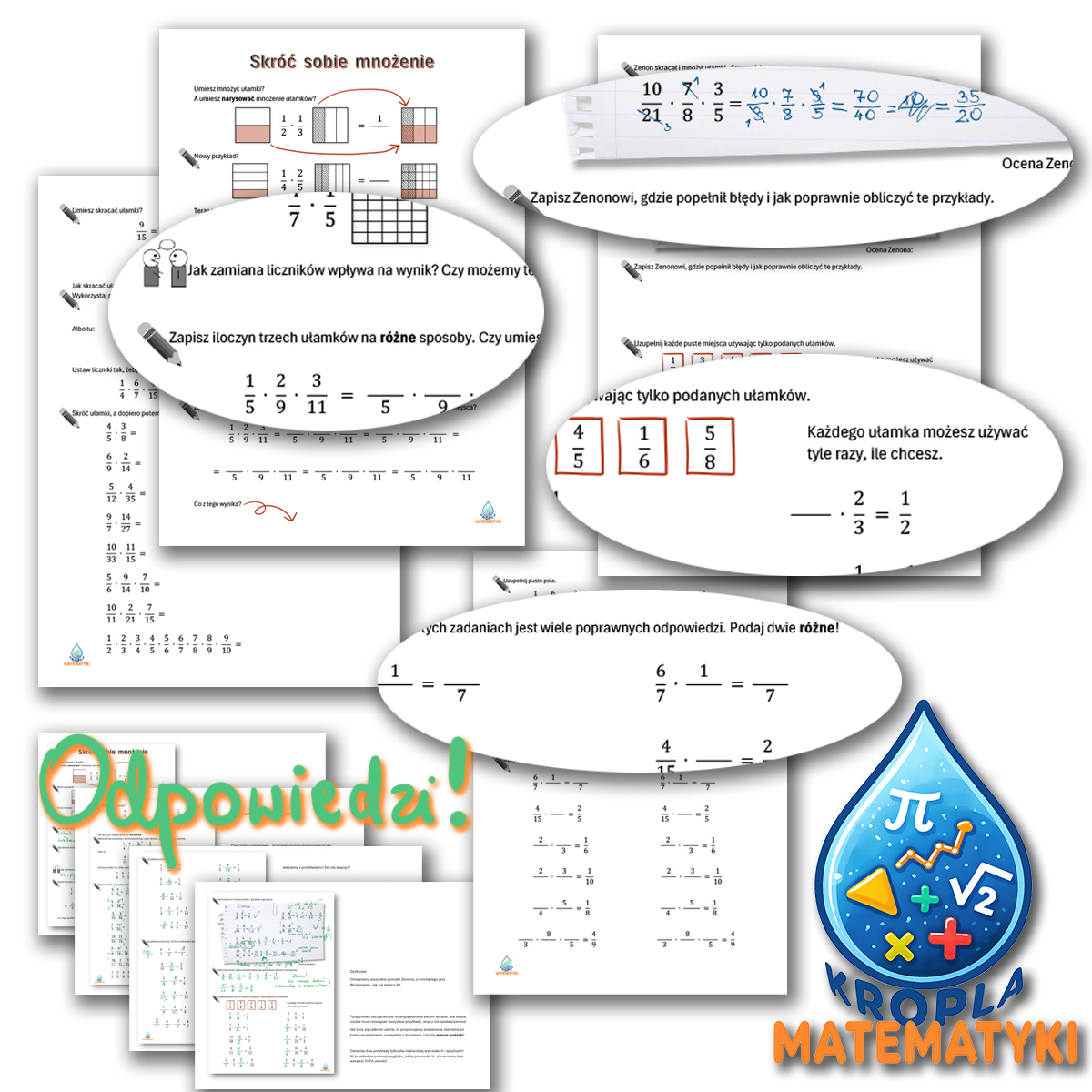 Przygotowałam karty pracy „Skróć sobie mnożenie”, które oferują wsparcie w eliminacji jednego z najczęstszych błędów - żmudnym mnożeniu wielkich liczb zamiast skrócenia ułamków w iloczynie.