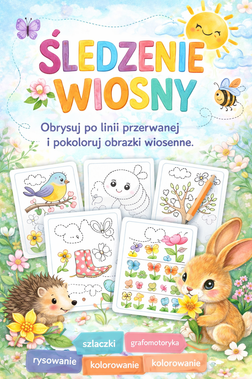 Zestaw 11 wiosennych kart pracy – „Śledzenie Wiosny” rozwijających umiejętności grafomotoryczne dzieci. Zadaniem dziecka jest obrysowywanie obrazków po linii przerywanej, a następnie kolorowanie ilustracji o tematyce wiosennej.