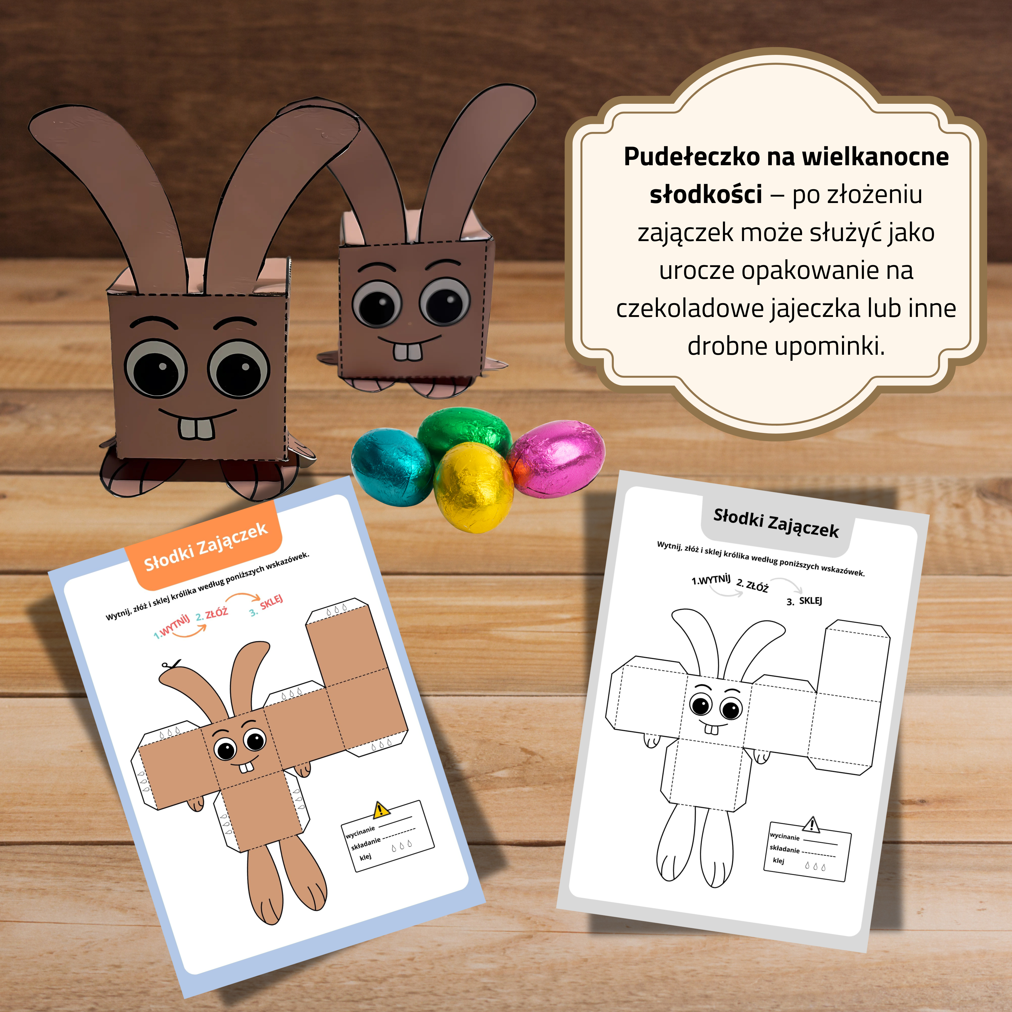 • Pudełeczko na wielkanocne słodkości – po złożeniu zajączek może służyć jako urocze opakowanie na czekoladowe jajeczka lub inne drobne upominki.