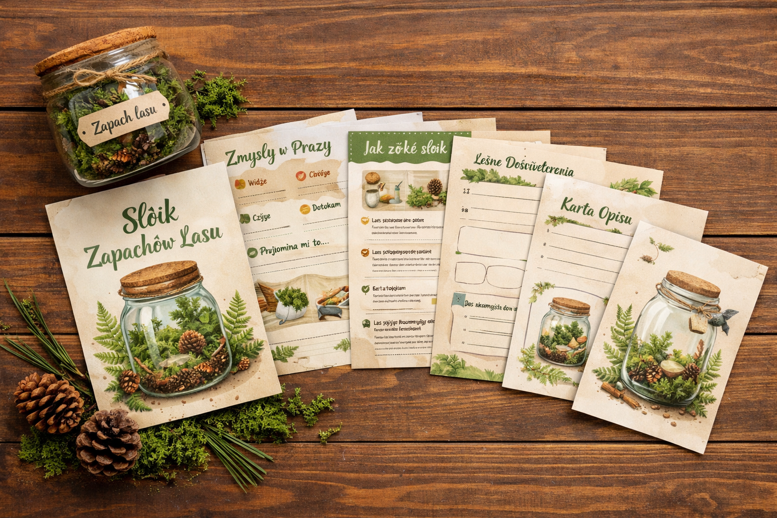 ✅ Piękny design – naturalne barwy, paprocie, mech, ilustracje w stylu akwareli.