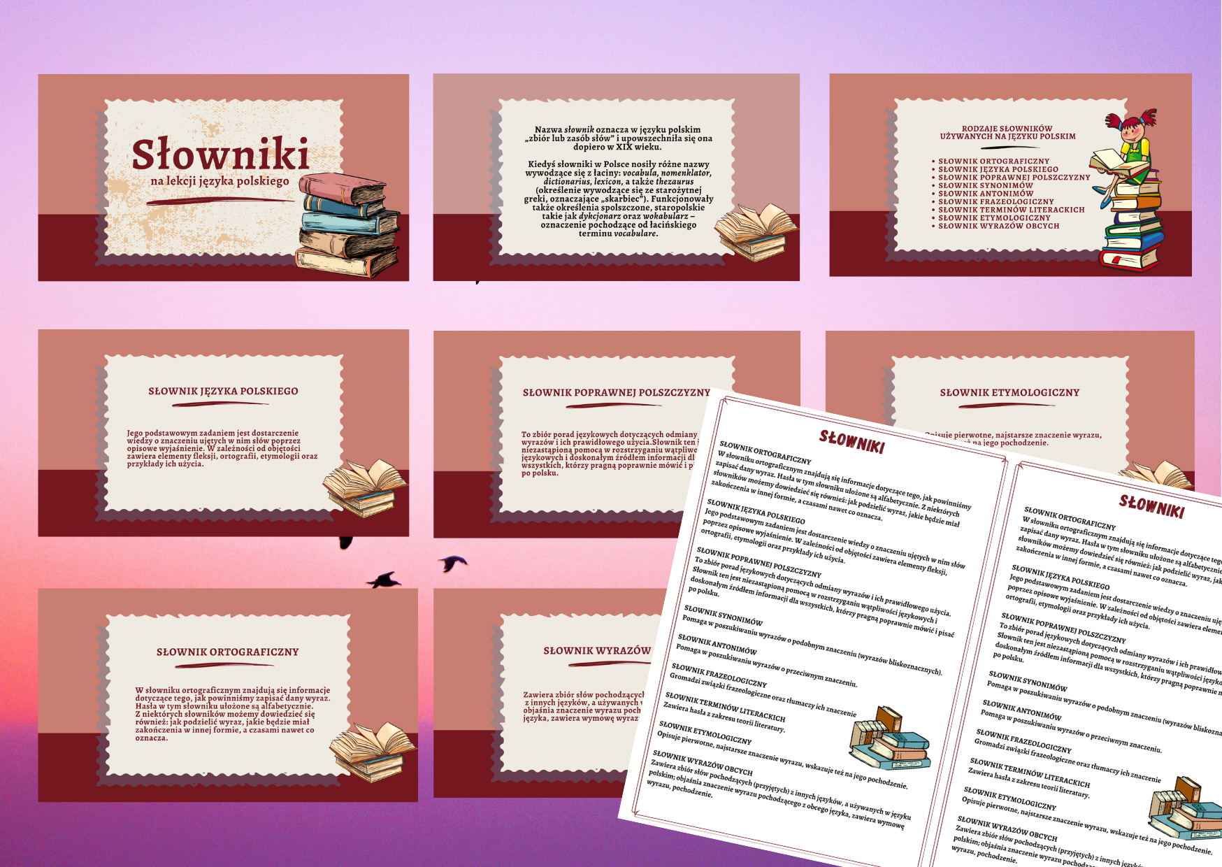 Zestaw zawiera prezentację (13 slajdów) oraz wklejkę z rodzajami słowników przydatnych na lekcjach języka polskiego.