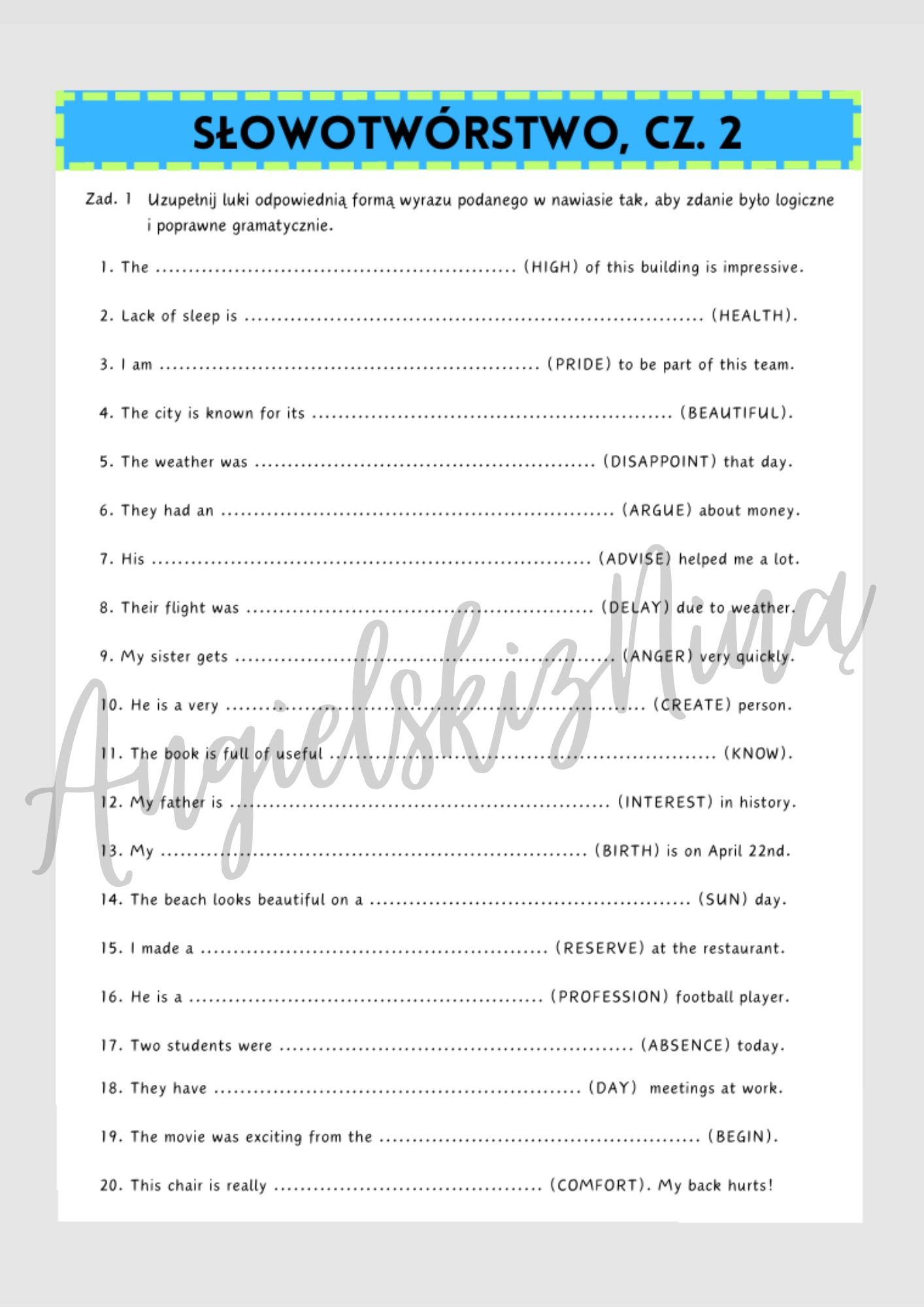 👉 aż 20 zdań do uzupełnienia odpowiednią formą wyrazu z nawiasu